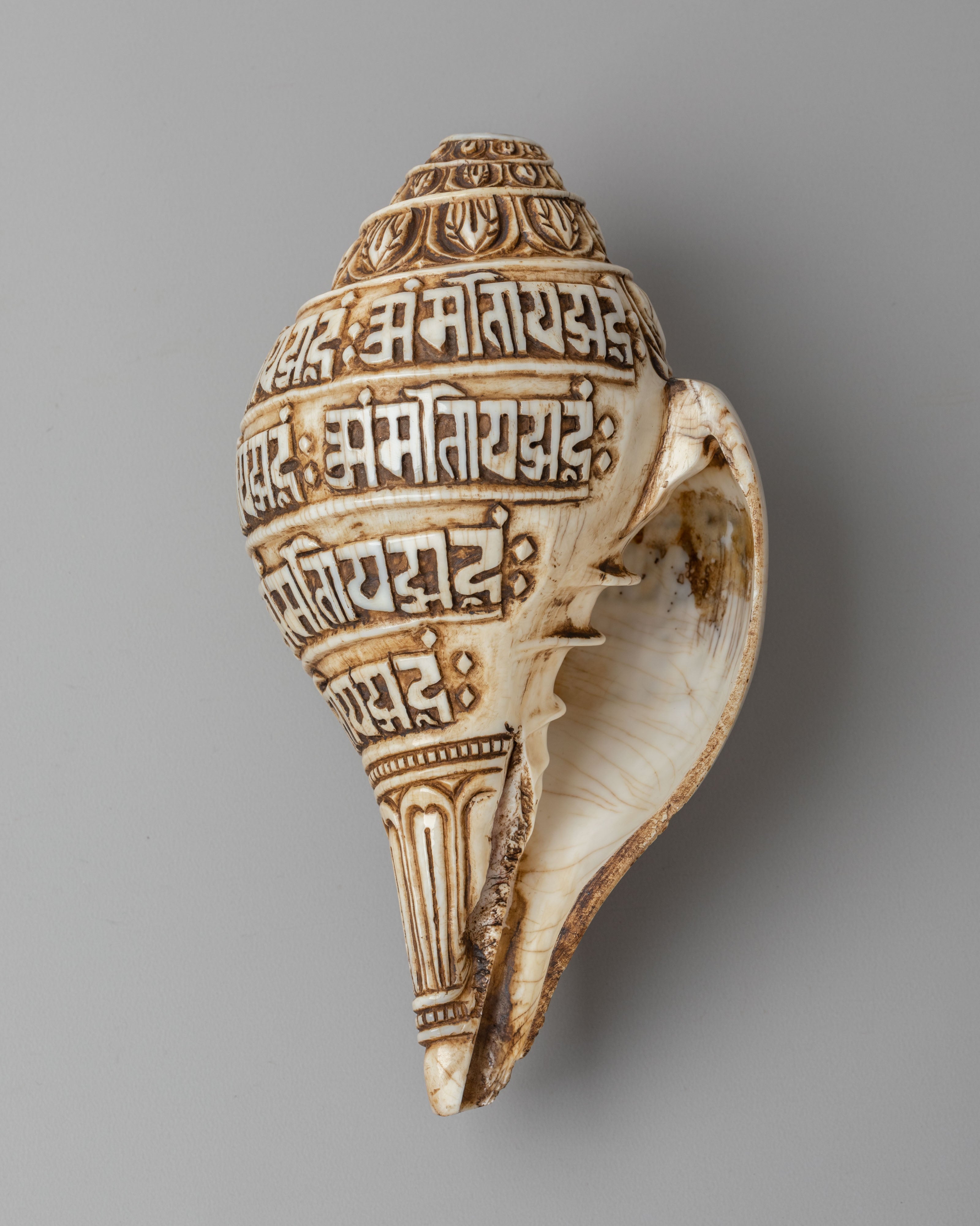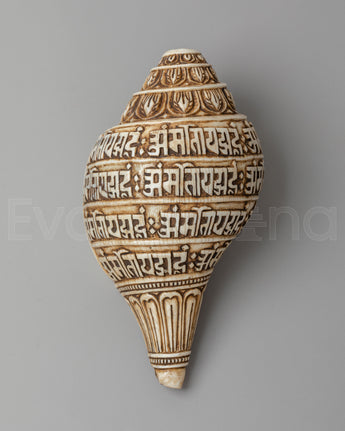 This Sacred Mantra Conch is a beautifully handcarved Himalayan ritual object crafted from a natural conch shell and adorned with finely engraved sacred scripts. The surface is wrapped with flowing lines of traditional Tibetan mantra inscriptions, carefully etched to create a harmonious and rhythmic visual pattern. The detailed carvings follow the natural spiral of the conch, enhancing its organic form while highlighting the spiritual significance of each mantra.