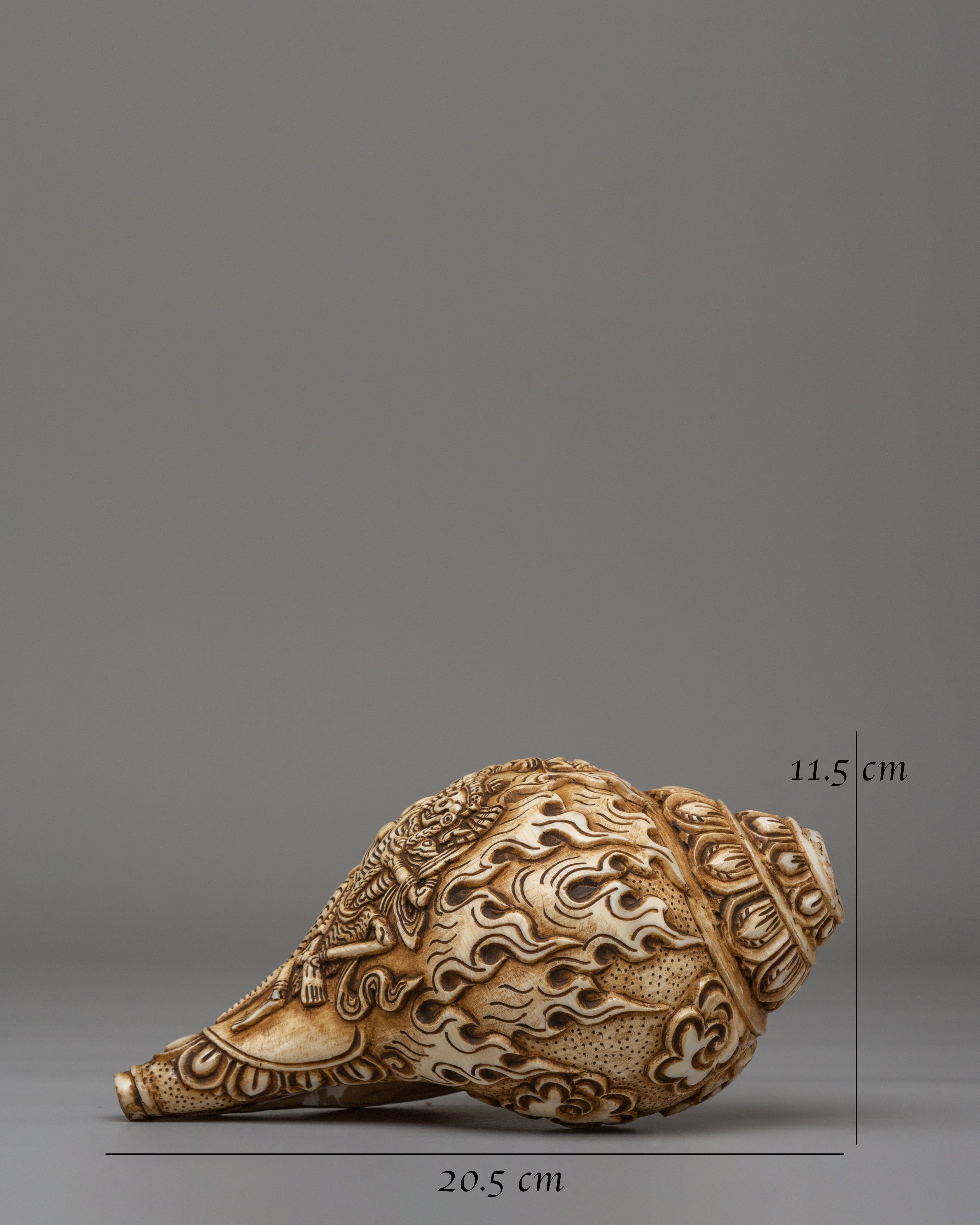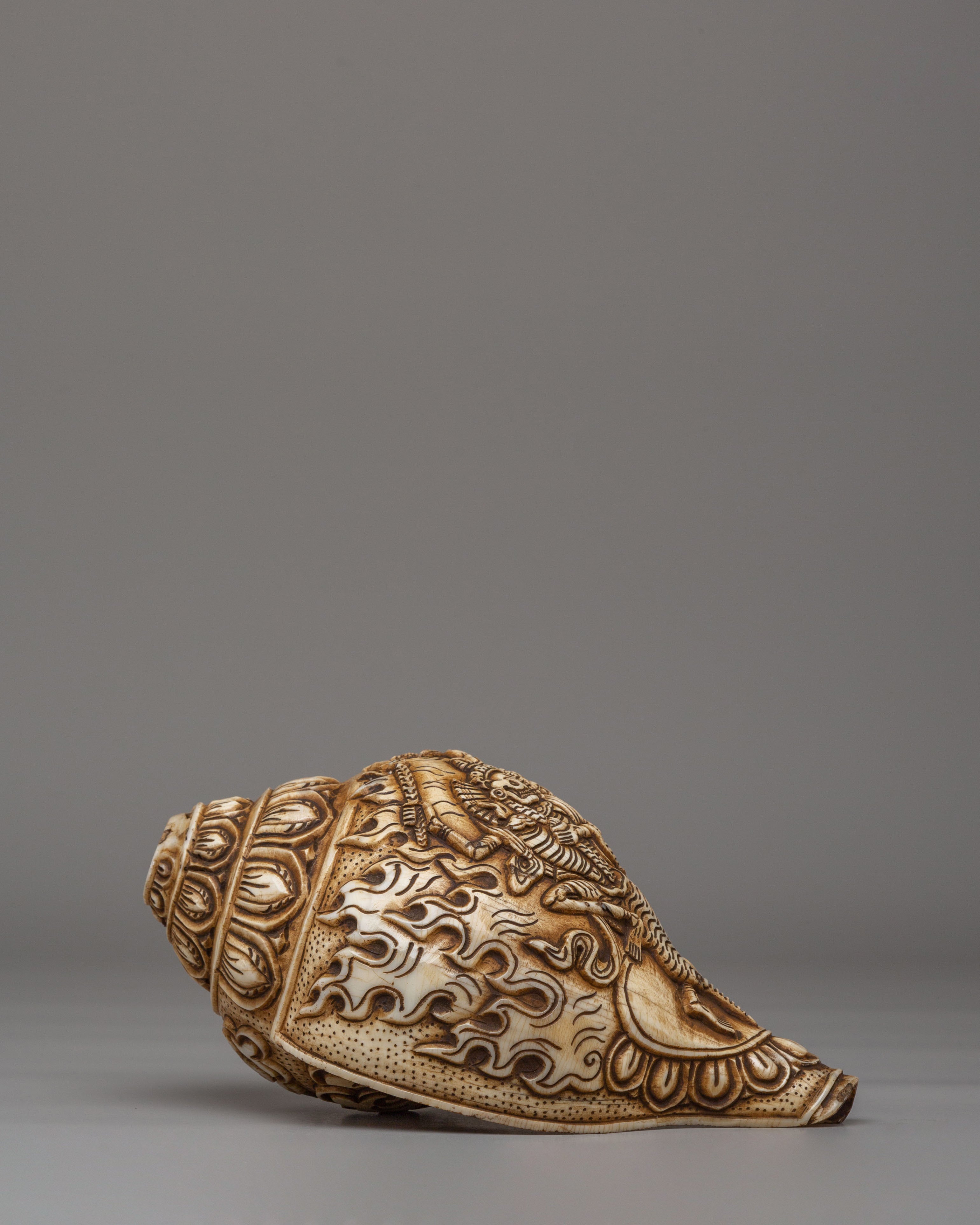 In Tibetan symbolism, the conch shell represents the sacred sound of the Dharma, calling beings toward awareness and clarity. The handcarved image of Chittipati, known as the Lords of the Cremation Grounds, conveys the profound teaching of impermanence and transformation. Surrounded by flame motifs symbolizing purification, this conch becomes more than a decorative object—it serves as a meaningful piece for meditation spaces, tantric practices, and spiritual altars.