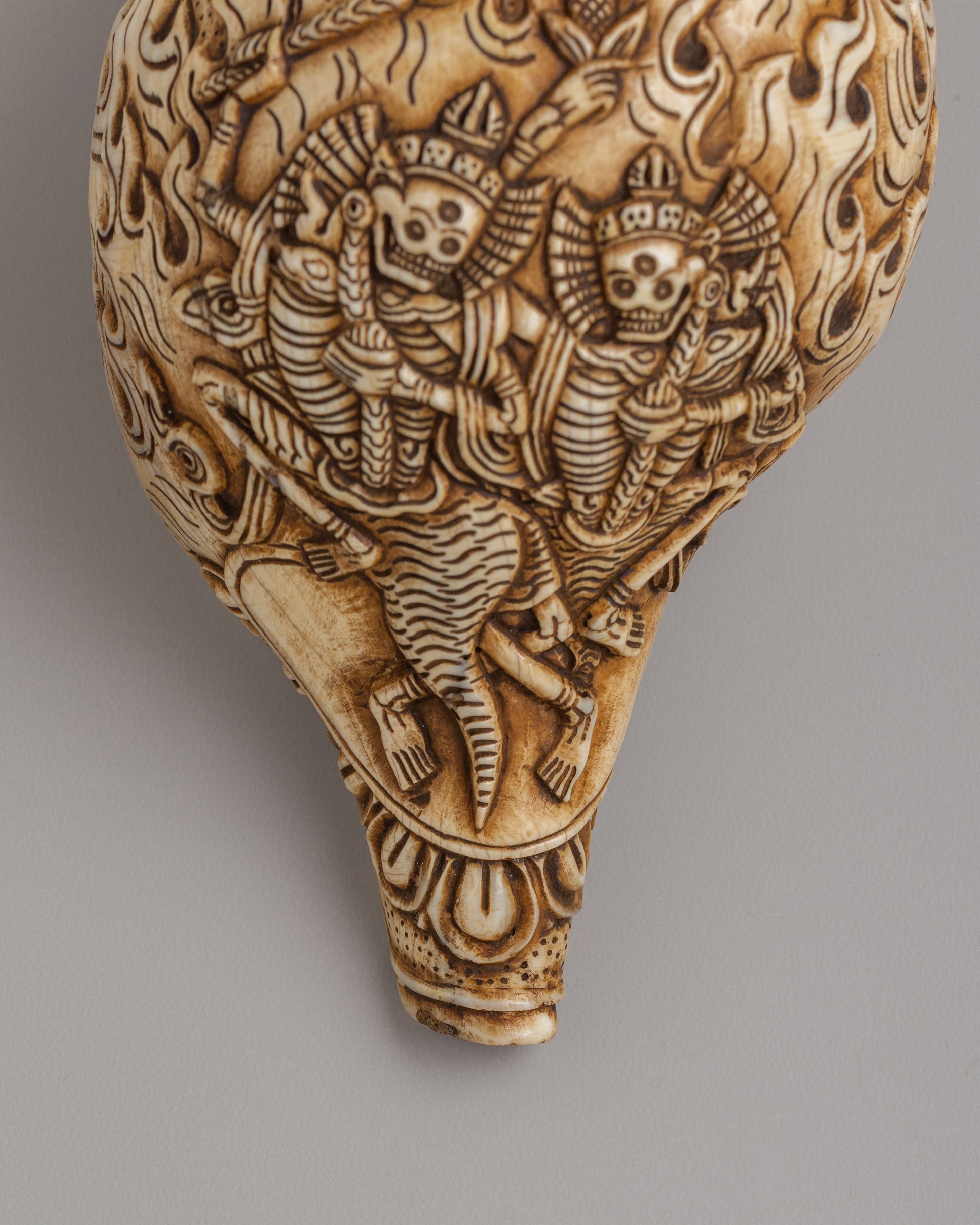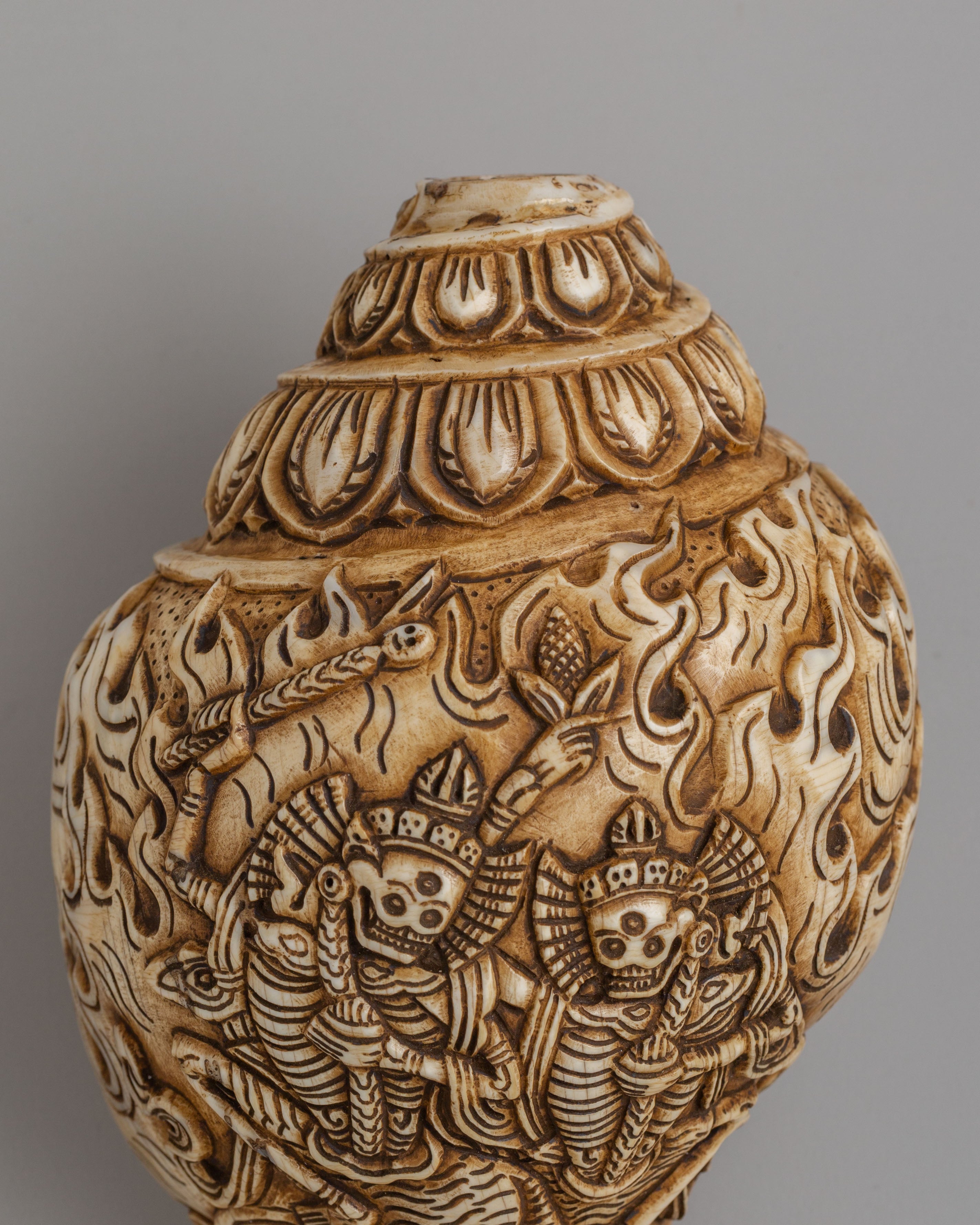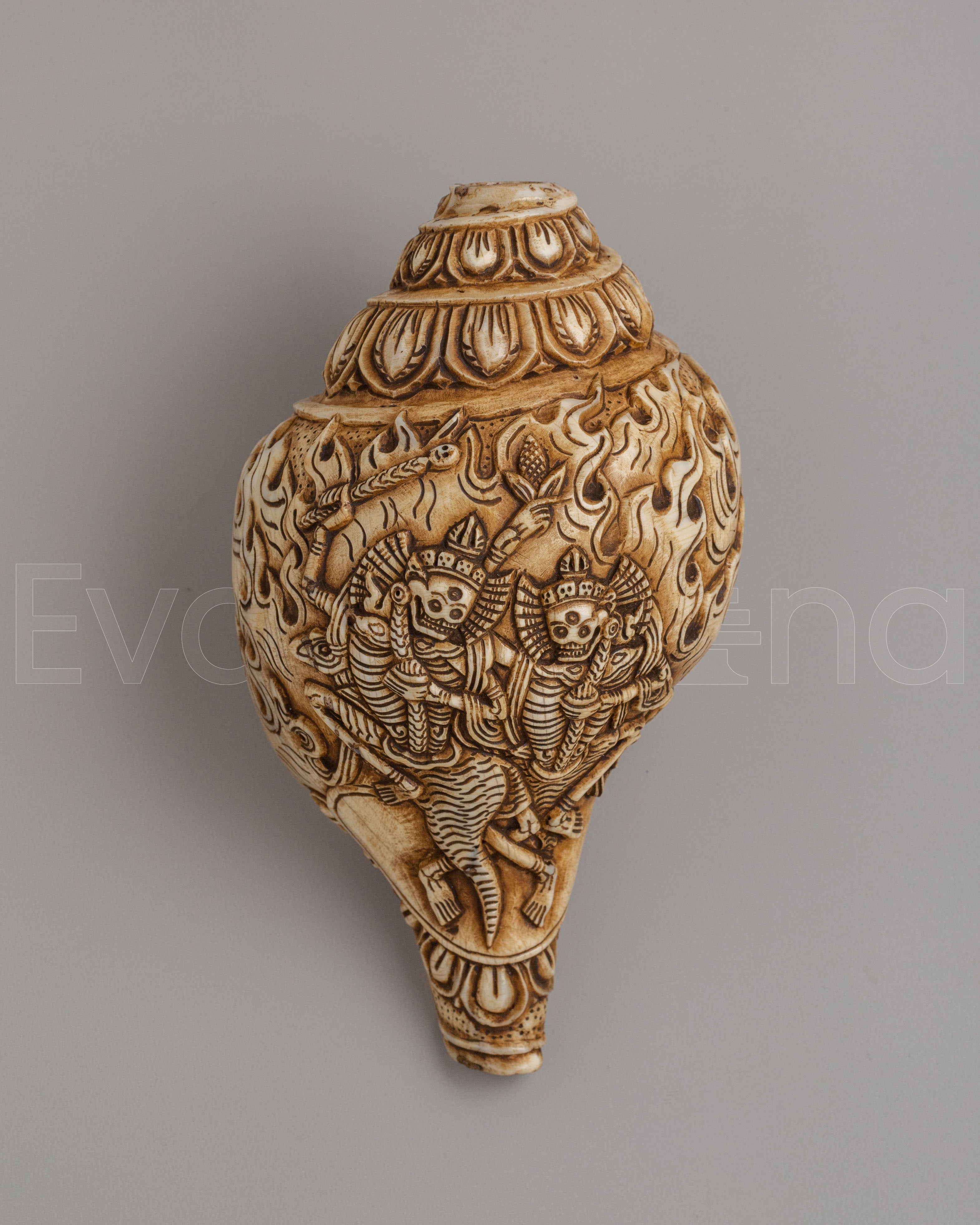 This Spiritual Chittipati Conch is a rare and symbolic Himalayan ritual object, handcarved from a natural conch shell with remarkable attention to detail. The surface reveals the dynamic depiction of Chittipati—wrathful skeletal deities dancing amidst flames—captured through intricate carving techniques. Flowing patterns and expressive figures wrap around the shell, creating a powerful composition that reflects deep-rooted Tibetan Buddhist artistry and spiritual storytelling.