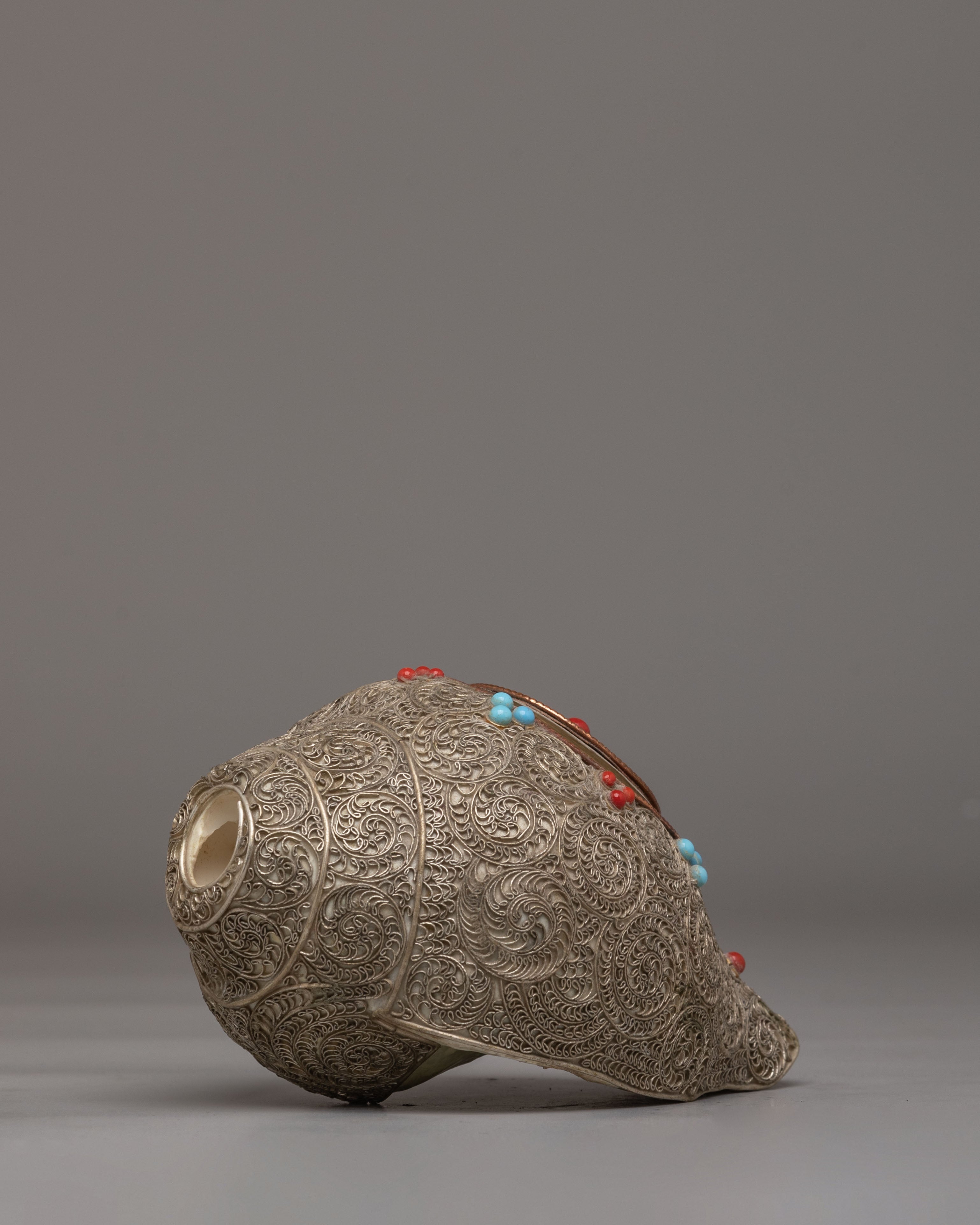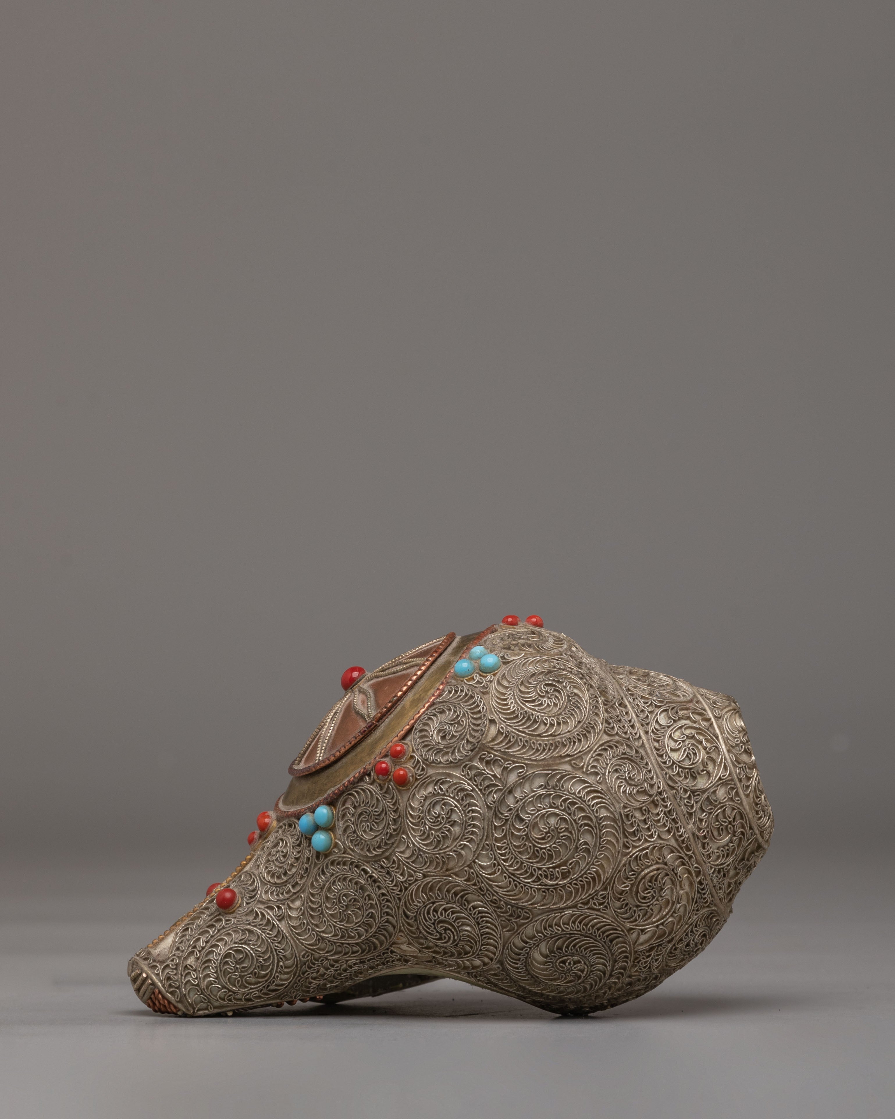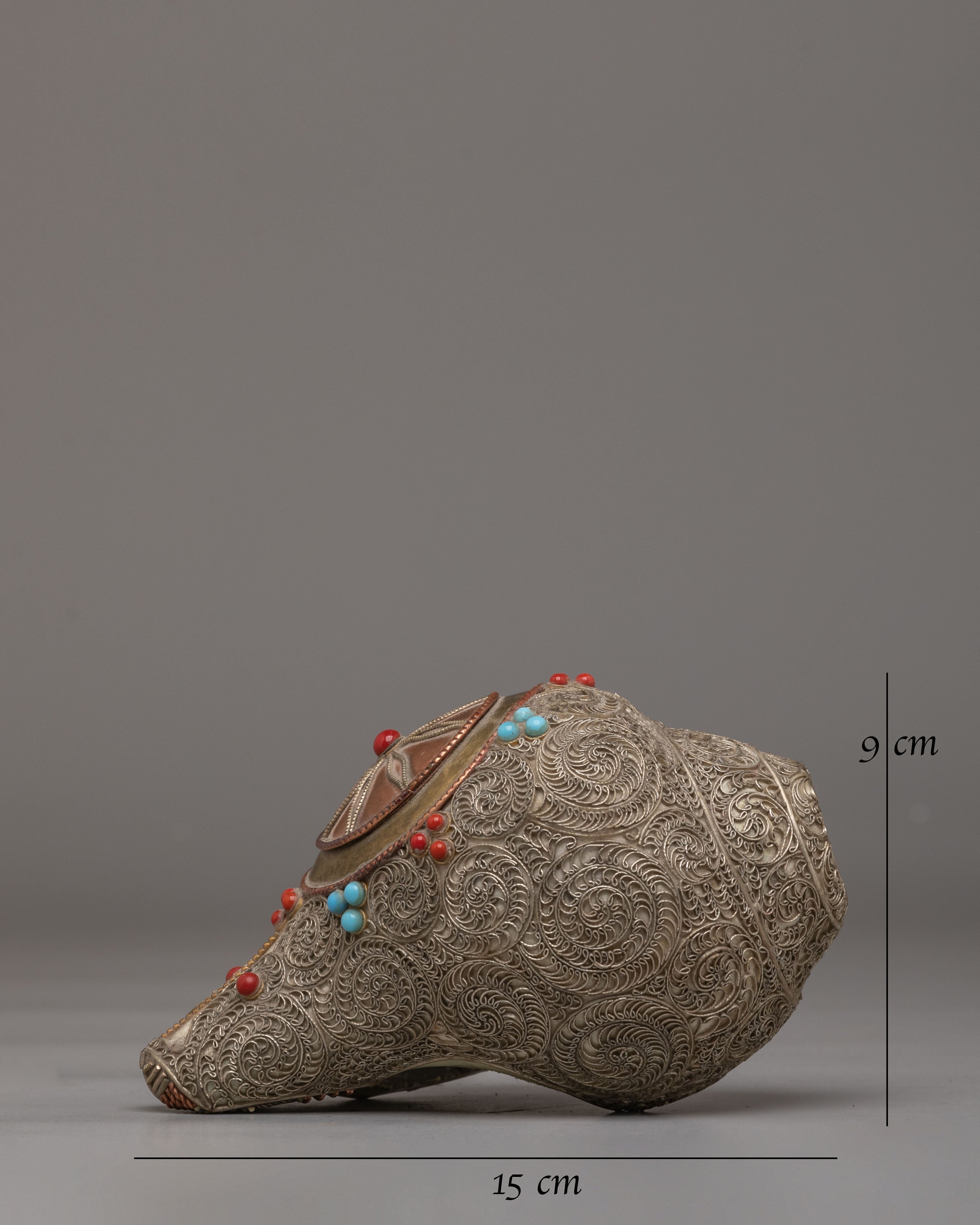 The Handcrafted Ritual Conch is a sacred instrument used in Buddhist and Hindu rituals, symbolizing the call to awaken spiritual consciousness and the spreading of divine teachings. Measuring 9 cm in height, 15 cm in length, and 9 cm in width, with a weight of 0.88 kg, this conch combines the sacred conch shell and white metal siku, creating a powerful ritual tool for both practitioners and collectors. The conch shell’s natural shape and texture enhance its connection to ancient spiritual practices.