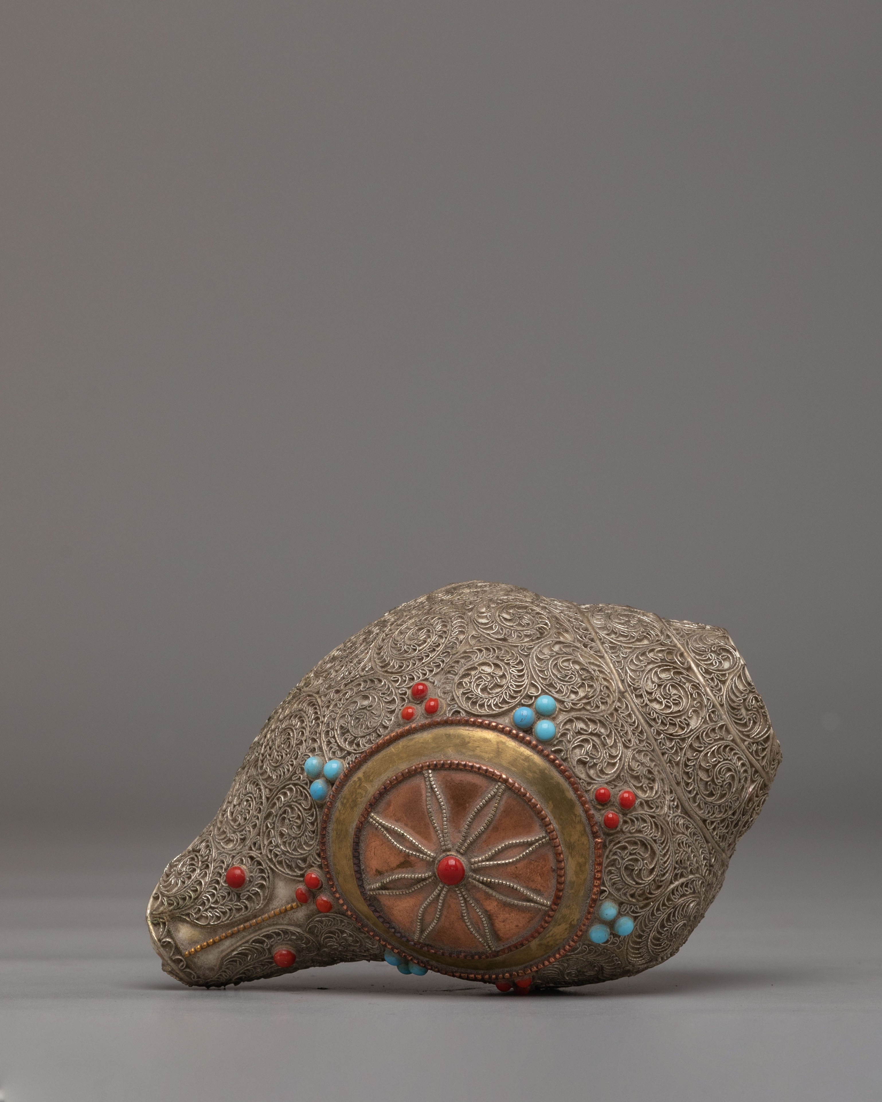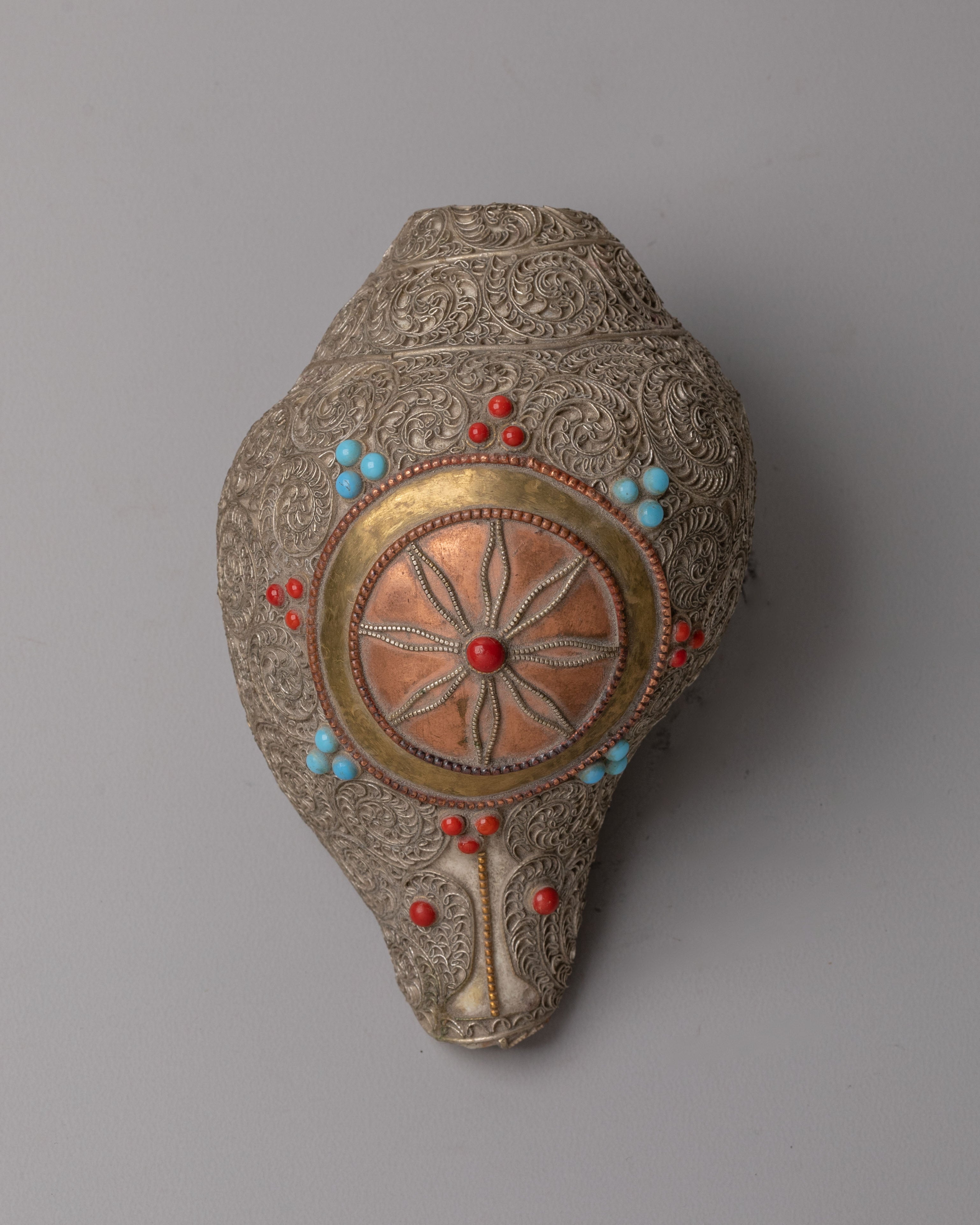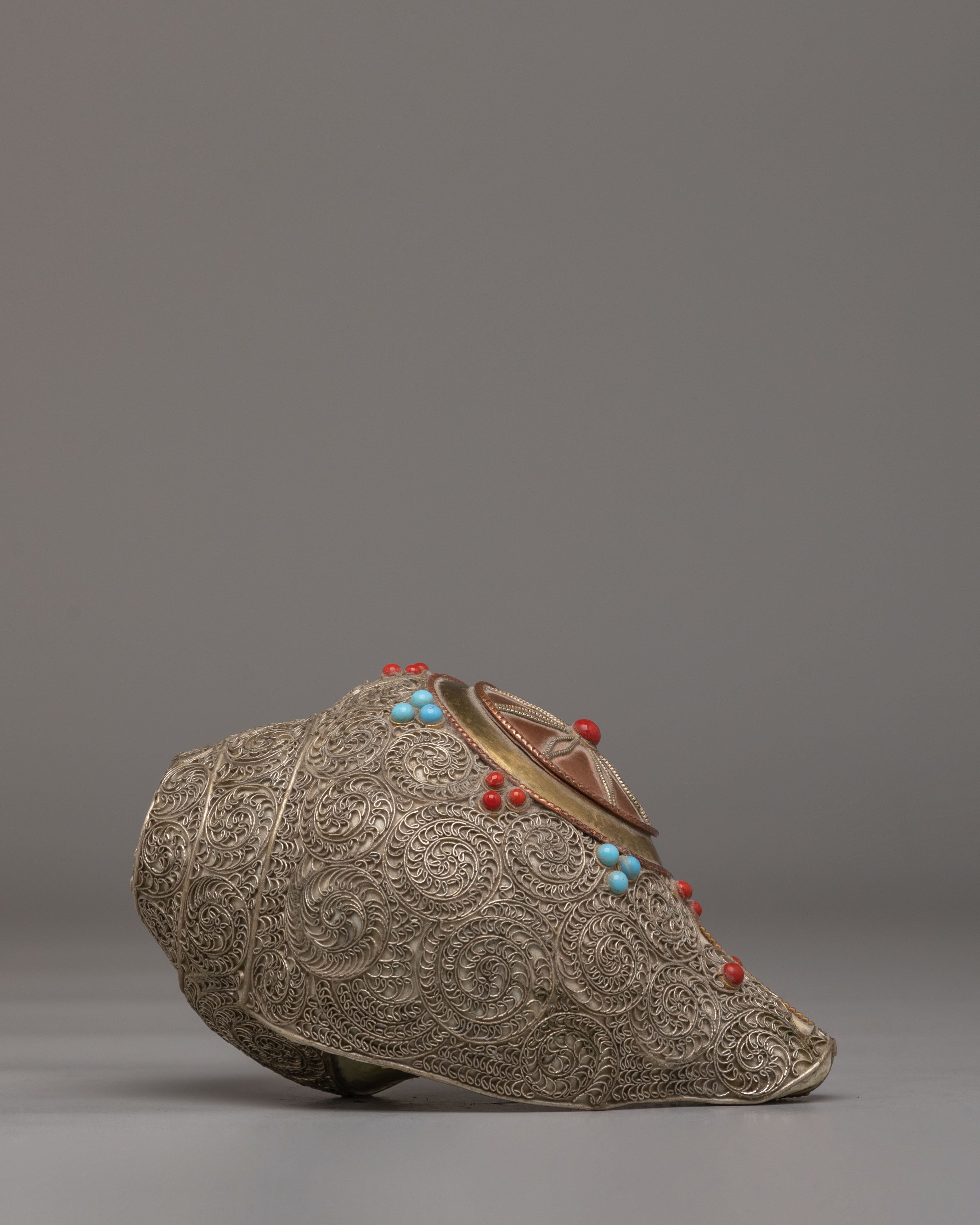 The Handcrafted Ritual Conch is a sacred instrument used in Buddhist and Hindu rituals, symbolizing the call to awaken spiritual consciousness and the spreading of divine teachings. Measuring 9 cm in height, 15 cm in length, and 9 cm in width, with a weight of 0.88 kg, this conch combines the sacred conch shell and white metal siku, creating a powerful ritual tool for both practitioners and collectors. The conch shell’s natural shape and texture enhance its connection to ancient spiritual practices.