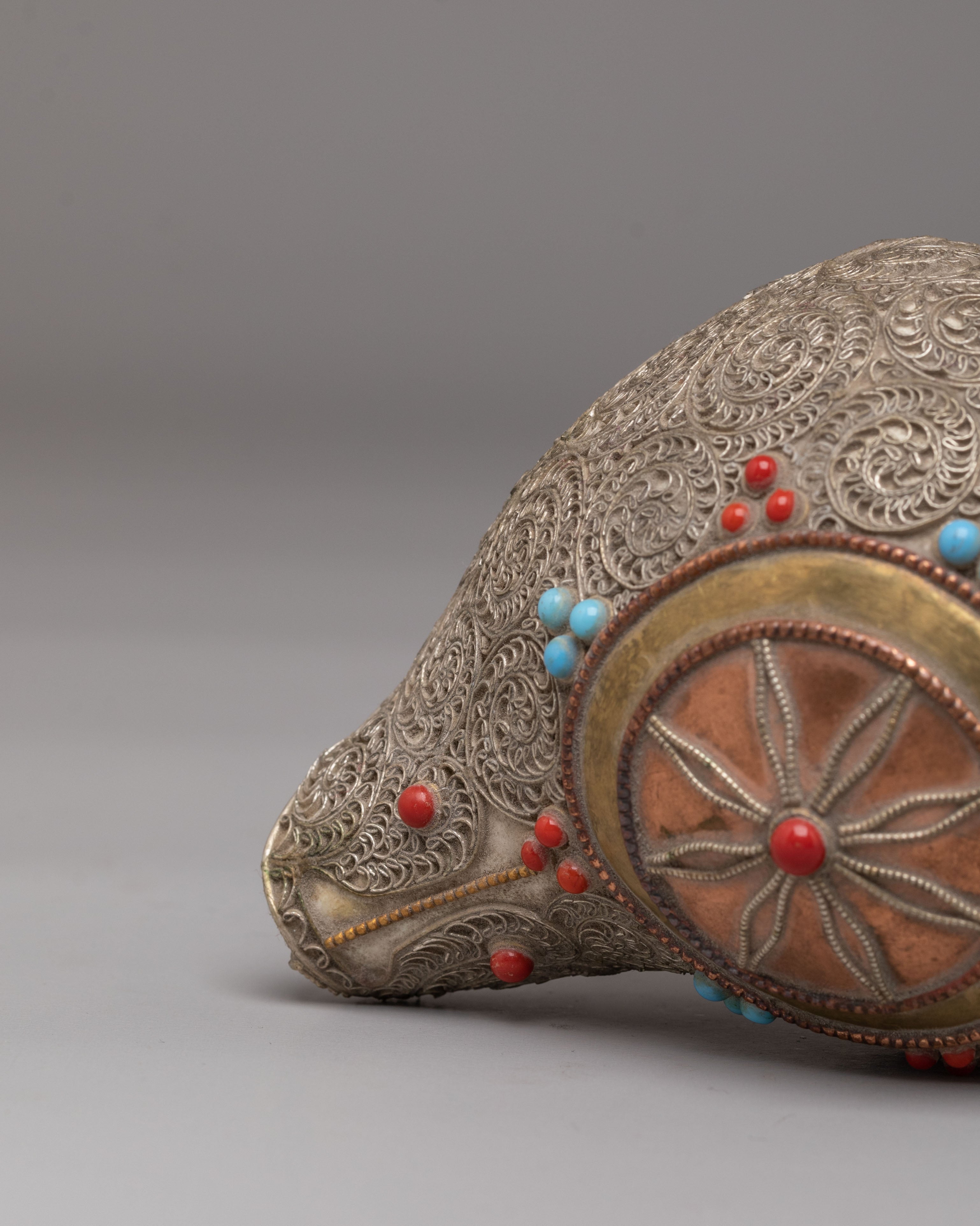 Whether used in a sacred space, meditation room, or as part of a spiritual practice, this Handcrafted Ritual Conch brings both aesthetic elegance and powerful symbolism. The conch shell and white metal siku combination make this piece a thoughtful gift for those seeking to deepen their spiritual practices or enhance the sacred atmosphere of their environment.
