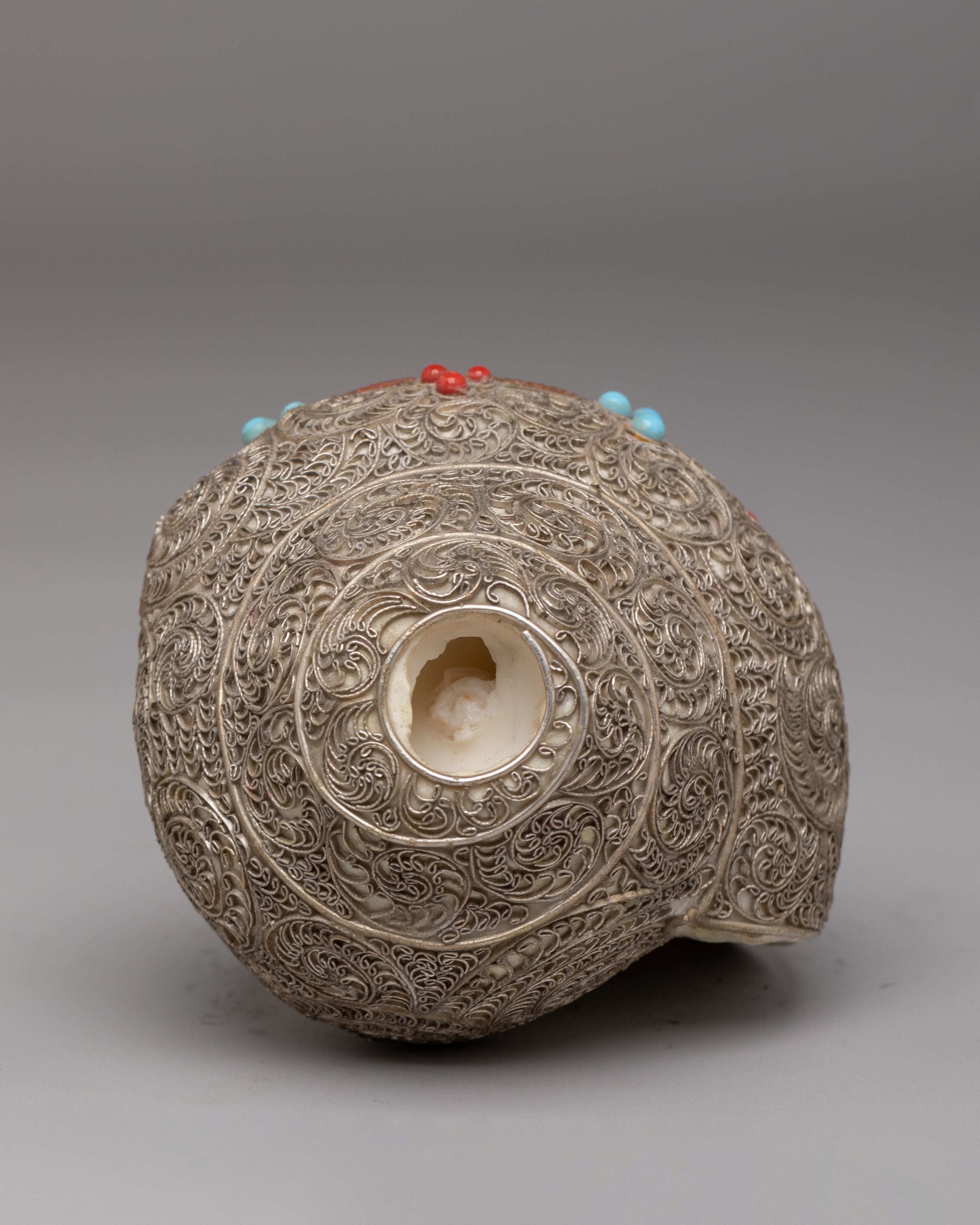 The Ritual Conch features intricate details in the white metal siku, enhancing its visual appeal while retaining its ceremonial significance. The conch shell, with its natural curves and spirals, represents the sound of the Dharma and the call to spiritual awakening, used in rituals to purify the mind and environment. This beautifully handcrafted conch is an essential element in Buddhist and Hindu ceremonies, symbolizing the victory of light over darkness and the spreading of divine wisdom.