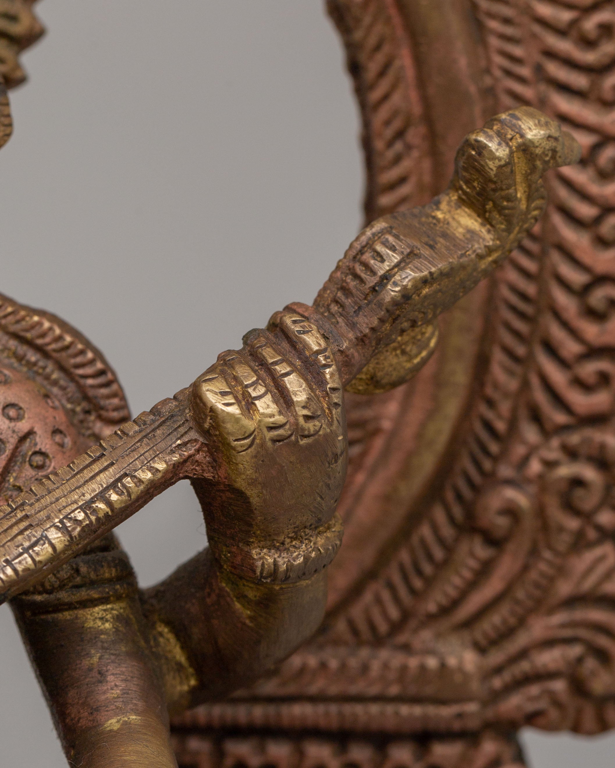 The sculpture depicts Goddess Saraswati seated gracefully, surrounded by intricate carvings, sitting on a lotus pedestal. Her serene expression exudes wisdom, while her posture embodies the balance between intellect and creativity. Saraswati’s veena is one of the most important symbols of the goddess, representing harmony, knowledge, and divine music. The multi-dimensional aura surrounding her highlights her role as the universal source of knowledge. The intricate motifs on the brass statue reflect the beauty of Hindu artistry, further enhancing the spiritual energy of this sacred piece.