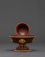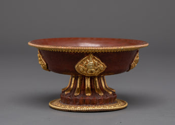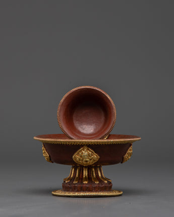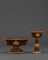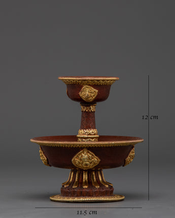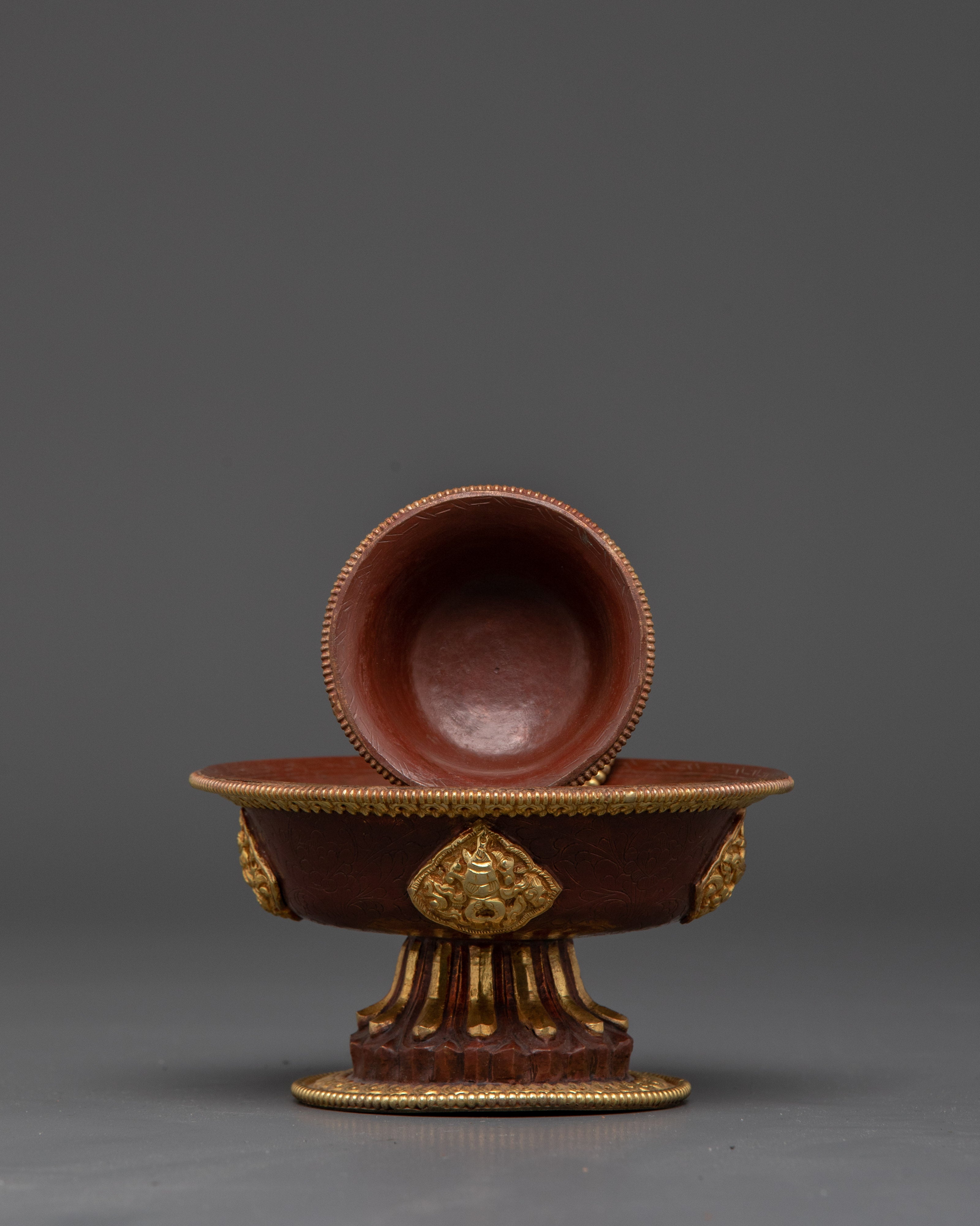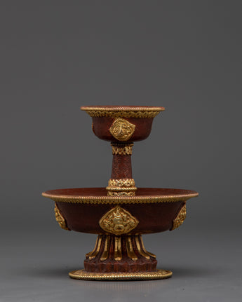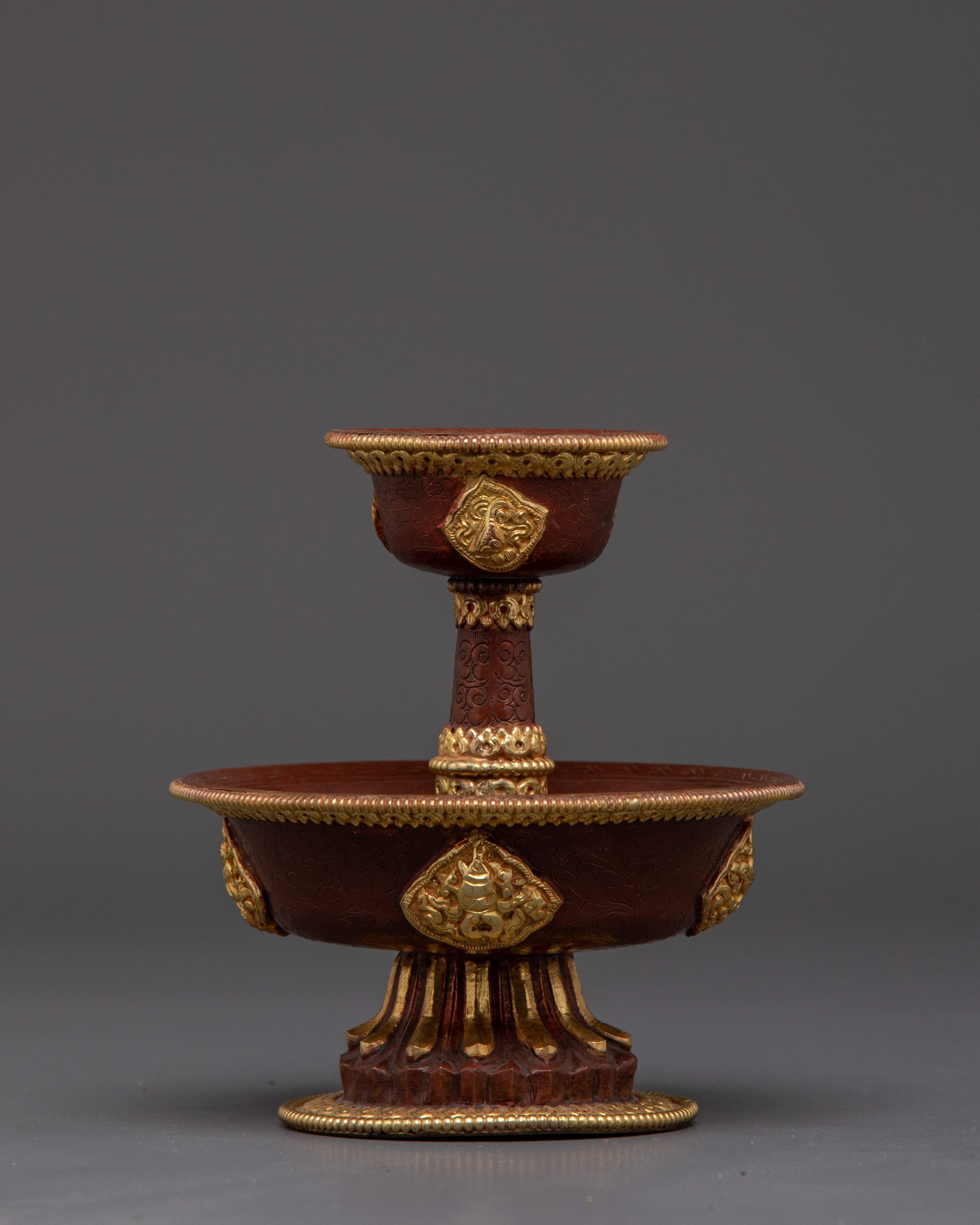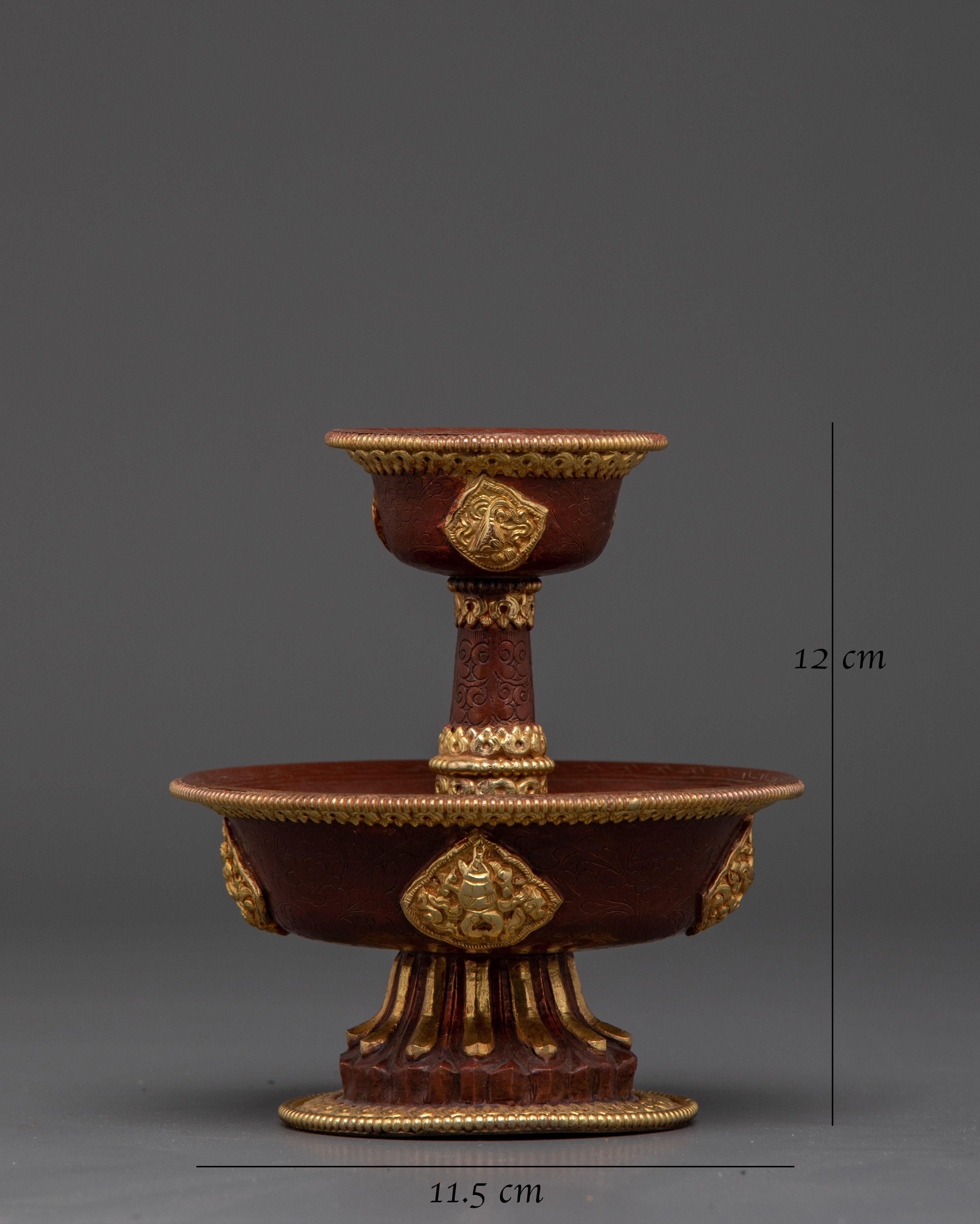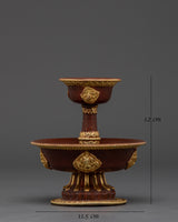 The Copper Serkyem Set is intricately designed with two tiers, featuring detailed gold-plated accents around the base and top. The lower tier is broad and strong, symbolizing stability and grounding, while the upper tier represents spiritual elevation. The acrylic colors highlight the set's beautiful details, making it not only a functional ritual tool but also a work of art. This set is traditionally used to hold offerings for the Buddha, representing generosity, gratitude, and the practice of offering as a form of respect.
