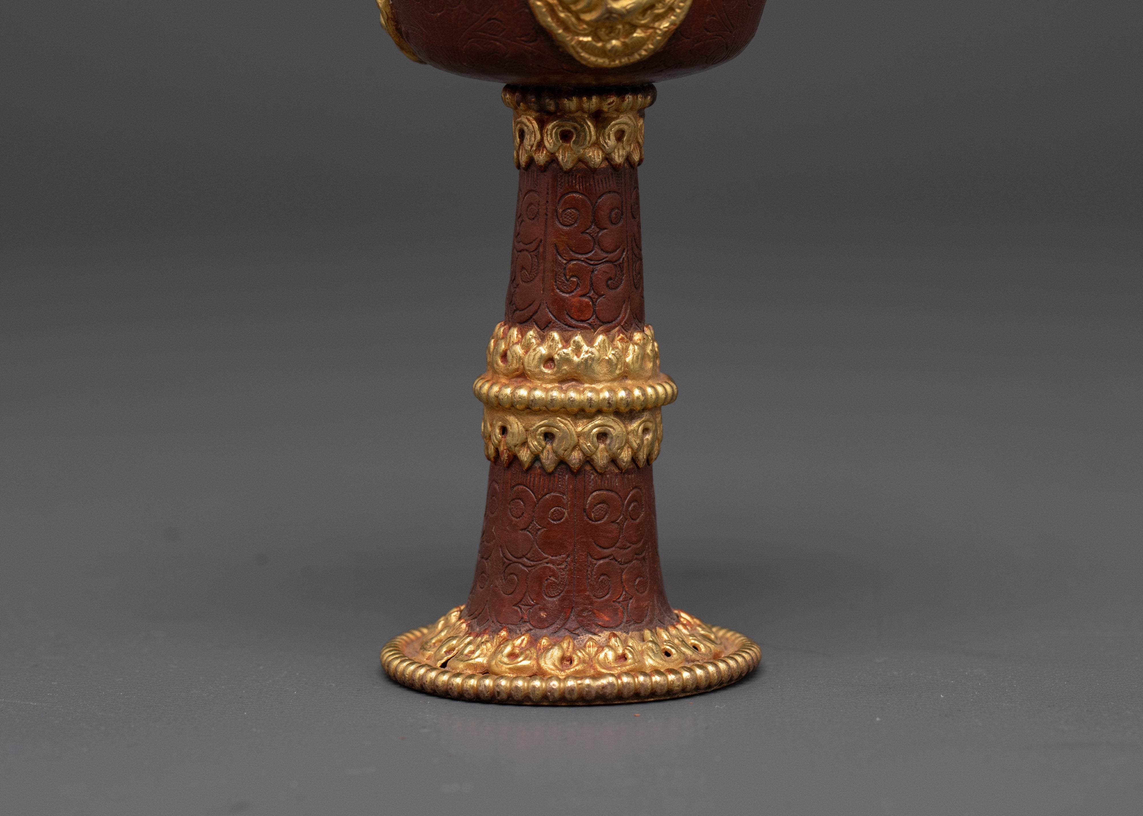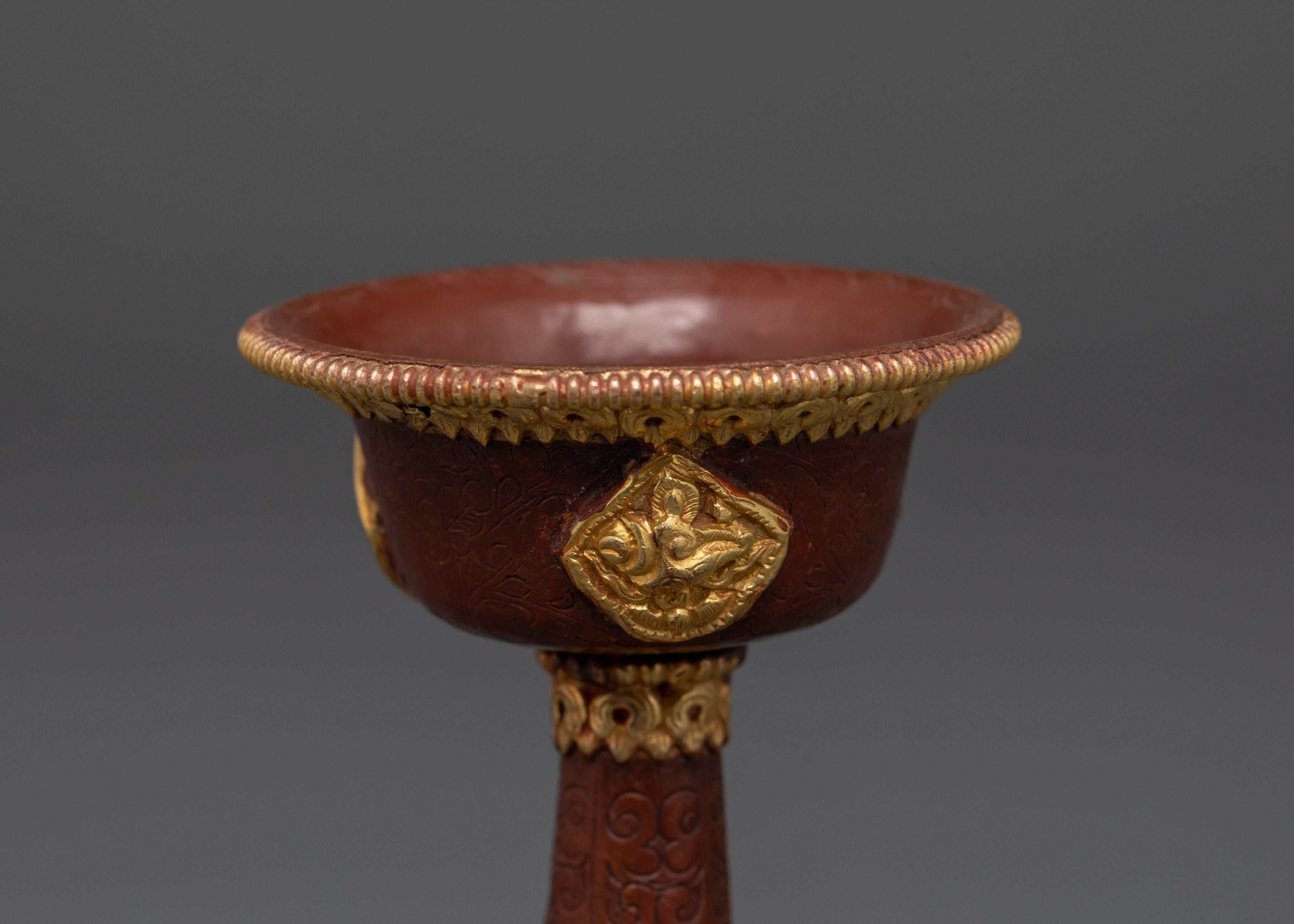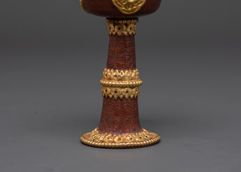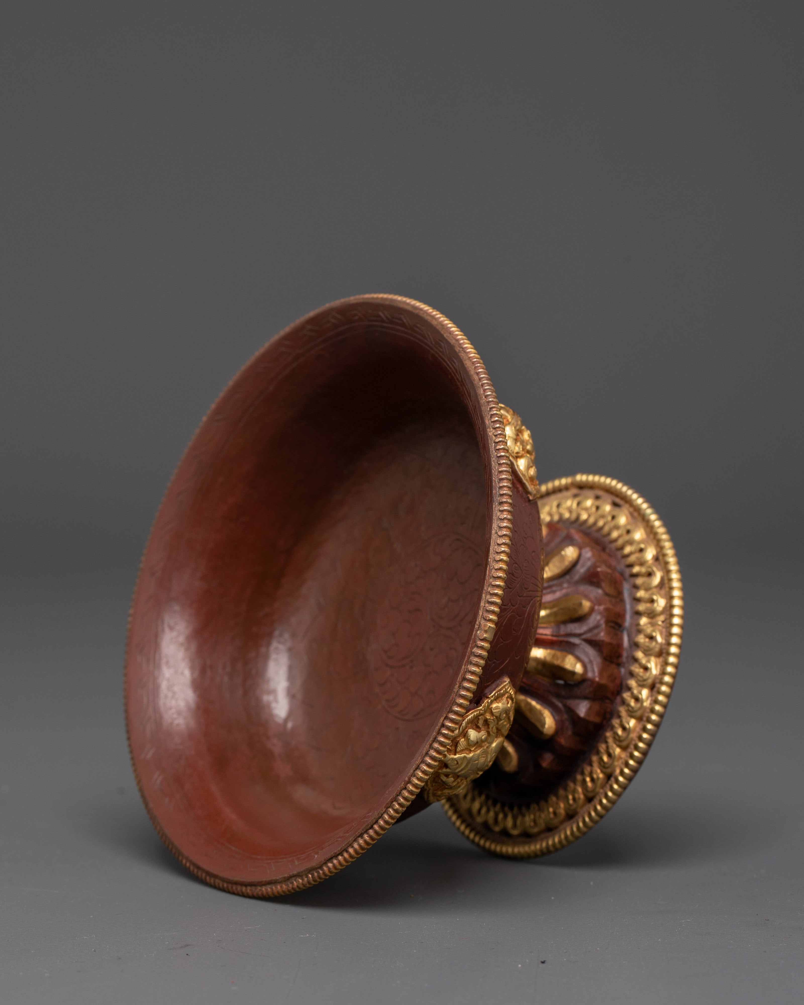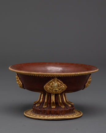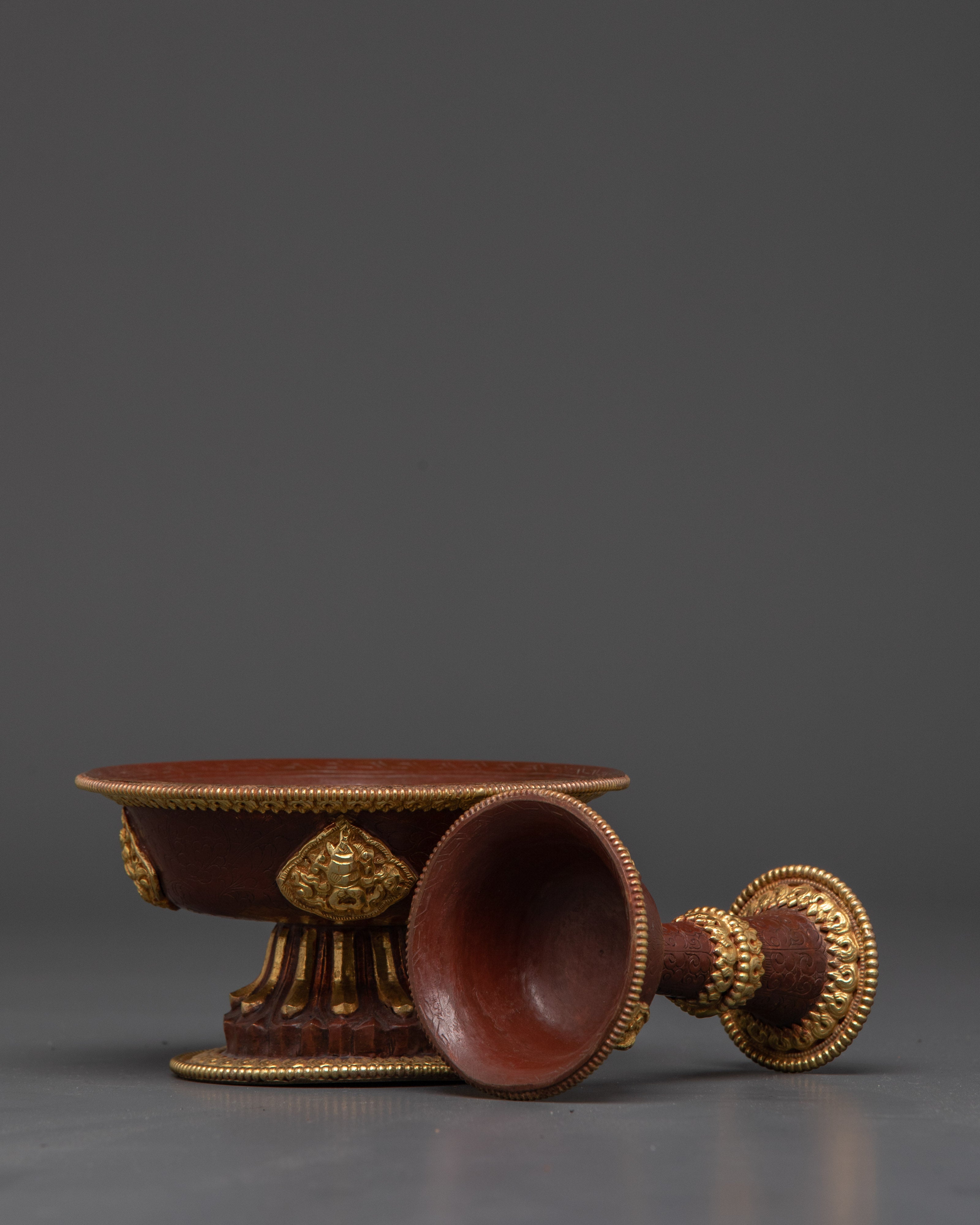 The Copper Serkyem Set is intricately designed with two tiers, featuring detailed gold-plated accents around the base and top. The lower tier is broad and strong, symbolizing stability and grounding, while the upper tier represents spiritual elevation. The acrylic colors highlight the set's beautiful details, making it not only a functional ritual tool but also a work of art. This set is traditionally used to hold offerings for the Buddha, representing generosity, gratitude, and the practice of offering as a form of respect.