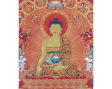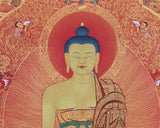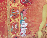 We have presented Buddha Life Story in a traditional Red and Gold (Marthang) style. We have used 24K gold as a precious offering object while painting the thangka. This is the tradition within the thangka painting community. We take it as an opportunity to gain merits by making offerings of precious objects to Buddhas and Bodhisattvas.