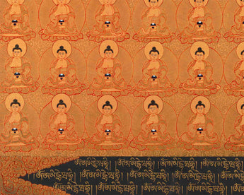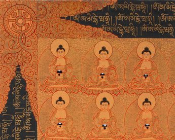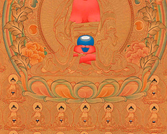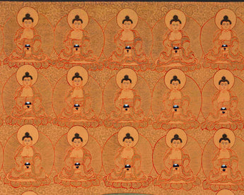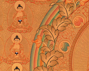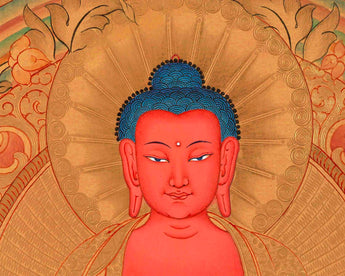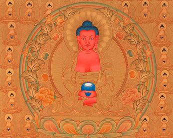 Shakyamuni Buddha's thangka depicts him with his left hand in the Dhyana "meditation" mudra. A Buddhist monk's customary alms bowl sits in the palm of his hand. Shakyamuni Buddha rests on a single lotus pedestal in full lotus position. Furthermore, Shakyamuni Buddha bears all of the classic markings of a Buddha. The third eye of knowledge, three necklines, an ushnisha top knot, and lengthened ears are all part of this look. Prince Siddhartha Gautama did, in fact, represent his social rank as Hindu royalty.