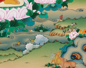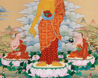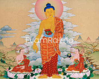Decorate your walls with the ageless picture of Buddha Shakyamuni with his loyal pupils, exuding a feeling of grace and tranquillity. This digital print is a true portrayal of Vajrayana spirituality, having been painstakingly and reverently crafted to capture the essence of traditional Thangka painting.