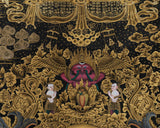 At the heart of the composition, Siddhartha Gautama sits in deep meditation atop a golden throne, symbolizing serenity, strength, and compassion. The throne is supported by blue elephants and lions, symbolizing peaceful power and wisdom. Above them, the mythical Sharabha, flanked by celestial Devas, represents balance and unity. Each figure and ornament surrounding the Buddha carries profound significance, including the six paramitas (perfections) that guide the spiritual path. The mythological protectors like the Garuda, Makara, and Naga serpents each represent vital virtues like transformation, protection, and spiritual strength.
