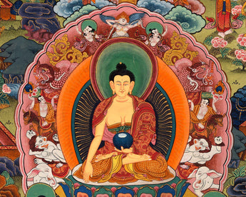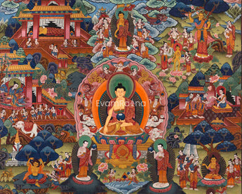 Shakyamuni Buddha Story, his serene countenance and compassionate gaze radiate from this high-quality digital Newari Paubha print. The intricate detailing of his physical attributes and iconography, such as the elongated earlobes and artistic depiction of different events of life, showcase the artist's mastery. This print captures the beauty and significance of Shakyamuni Buddha and his crucial life event. Add a sacred and meaningful addition to your spiritual practice or home décor collection with this stunning artwork. Let the calm presence of Shakyamuni Buddha bring peace and harmony to your space.