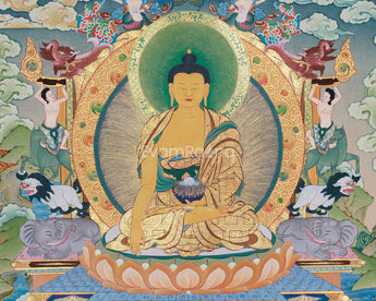 In this depiction, Shakyamuni Buddha sits at the center on a radiant lotus throne, appearing calm yet assertive—his golden robes shimmer with divine presence. Behind him, a luminous halo and an ornate arch frame his serenity, with celestial beings paying homage among clouds and mythical creatures. At the throne's base, his two main disciples, Sariputra and Maudgalyayana, dressed in golden garments, hold symbolic tools representing wisdom and spiritual strength. Together, they form a sacred trio: the Enlightened One in perfect stillness, supported by his loyal followers, embodying the transmission of wisdom, compassion, and discipline.