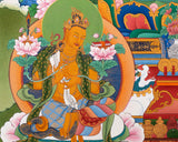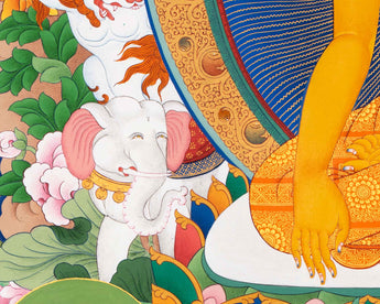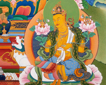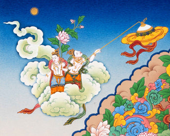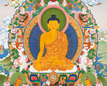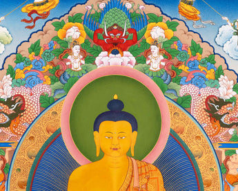 We have traditionally hand-painted the thangka of Shakyamuni Buddha, and we print it in high-quality cotton canvas. We have depicted a deity sitting atop a moon disc lotus throne with a serene expression. The exquisite clouds rolling beneath the blue sky look mesmerizing. The dark green halo illuminates his face while the vibrant nimbus engulfs his presence. You can make use of this print in various meditation and yoga practices. You can also use it for indoor purposes like home decor and in different Buddhist ceremonies.
