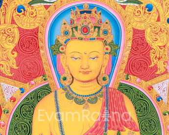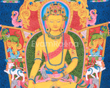 The Siddhartha Gautama Thangka Print encapsulates the essence of serenity and enlightenment embodied by the historical Buddha, Siddhartha Gautama. Rendered with intricate details and vibrant colors, this artwork portrays Siddhartha in deep meditation, radiating a sense of inner peace and tranquility. With his eyes closed in profound contemplation and hands in the gesture of meditative equipoise, Siddhartha Gautama serves as a timeless symbol of spiritual awakening and liberation. Displayed in homes, meditation spaces, or temples, this Thangka Print invites viewers to connect with the Buddha's teachings on the Four Noble Truths and the Eightfold Path, guiding them on their own journey towards inner peace and enlightenment. As practitioners contemplate the Siddhartha Gautama Thangka Print, they are reminded of the Buddha's compassionate wisdom and his timeless message of liberation from suffering.