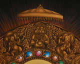 The throne behind him is richly detailed, featuring celestial beings, mythological creatures, and symbolic elements like elephants and floral motifs. A radiant halo surrounds the Buddha, symbolizing his divine wisdom. The print preserves the spiritual integrity and artistic finesse of traditional Buddhist thangka art, making it an ideal addition to meditation rooms, personal altars, or spaces dedicated to peace and mindful reflection.
