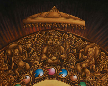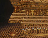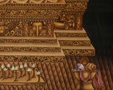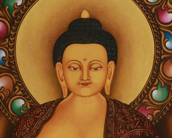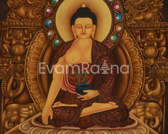The Buddha Shakyamuni Thangka Print is a high-quality giclée reproduction on cotton canvas, capturing the profound symbolism and serene beauty of the Enlightened One. The Buddha is depicted in a meditative posture, with his left hand holding a monk's bowl symbolizing renunciation and his right hand in the earth-touching mudra, representing his enlightenment beneath the Bodhi tree.