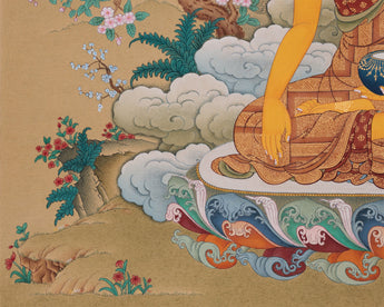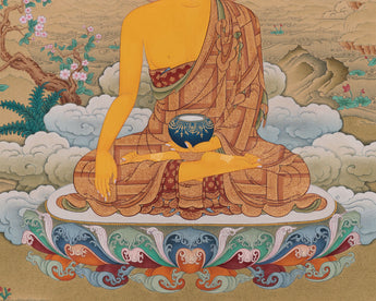 Shakyamuni Buddha, regarded as the Dharma Teacher, embodies the wisdom and compassion that are central to Buddhism. Born as Siddhartha Gautama, he achieved enlightenment beneath the Bodhi tree and delivered profound teachings aimed at freeing all beings from suffering. In this thangka, Shakyamuni appears with a calm demeanor, his right hand in the earth-touching mudra—symbolizing his enlightenment—and his left hand resting in meditation on his lap. The artist employs the Karma Gadri tradition to depict the enlightened one amidst expansive landscapes and delicate details, highlighting clarity, purity, and his limitless presence.