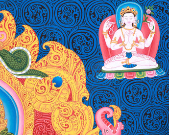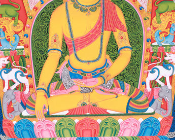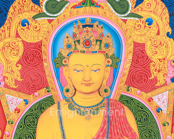 Shakyamuni Buddha, the founder of Buddhism, is honored as a supreme teacher, and his life and teachings serve as the foundation for the Dharma. By creating an environment of inspiration and reverence, this Thangka enhances any space used for spiritual practice and is a potent meditation tool for Buddhists and their admirers.