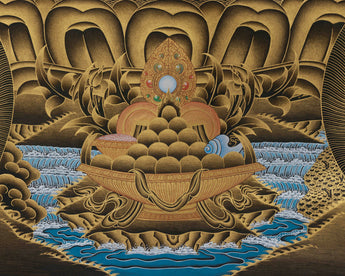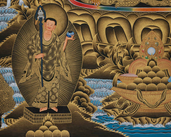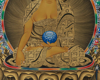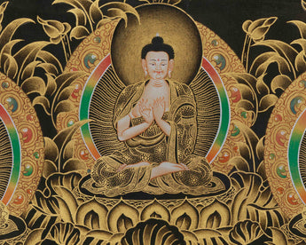 The Gold Thangka of Shakyamuni Buddha beautifully showcases Buddha at the center, seated on a luminous lotus base. His left-hand cradles a monk's bowl, representing his role in providing wisdom and sustenance to all beings. The Bhumisparsha Mudra, or earth-touching gesture, is illustrated by his right hand, signifying the crucial moment when he called the earth to witness his enlightenment beneath the Bodhi tree. Made with acrylics, this artwork ensures durability while offering a refined texture that deepens its spiritual meaning. Additionally, authentic 24K gold on a black canvas enhances its luminous, spiritual glow.