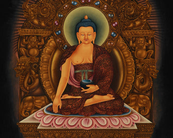 The set of flickering butter lamps at the front of the throne illuminates the sacred offering space with a warm glow, signifying the eradication of darkness and the illumination of wisdom. Every aspect of this Thangka has been rendered with meticulous detail, blending rich Paubha elements with an unparalleled sense of realism. A rare and remarkable work of art, this Thangka is perfect for meditation areas, individual shrines, or sacred collections due to its gold-on-black canvas combination. Its powerful presence guides practitioners toward enlightenment, wisdom, and inner calm by acting as a continual reminder of the Buddha's teachings.