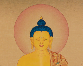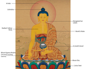 The Buddha is shown calling the ground to witness his waking in the ground-touching Gesture (Bhumi Sparsha Mudra), a potent emblem of enlightenment. The elongated earlobes symbolize Buddha's renunciation of material wealth, the monk's bowl represents purity and detachment, the moon disc and lotus seat indicate the transcendent purity of the enlightened mind, and the Ushnisha (cranial protuberance) signifies supreme wisdom. Each detail in this Thangka is loaded with meaning. The Buddha's bright yellow torso, wrapped in a colorful monk's robe and surrounded by a glowing halo, shines as a symbol of kindness and awareness.