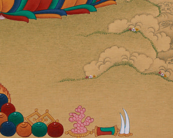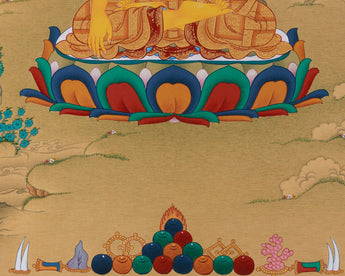 This Hand-Painted Buddha in Bhumi Sparsha Mudra Thangka was made in the classic Karma Gadri style. The Karma Gadri painting style, which originated in Tibet in the 17th century, is celebrated for its tranquil compositions, contemplative nature, and symbolic landscapes. The use of natural Lhasa stone colors gives the artwork a vibrant yet earthy palette, evoking the purity and authenticity of traditional Himalayan art. This Thangka, which offers both spiritual depth and visual brilliance, is formed on fine cotton canvas and boasts beautiful artistry using genuine 24K gold.