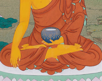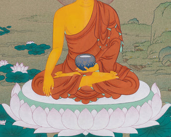 The Historical Buddha Thangka is a truly outstanding piece, prepared from vibrant materials that ensure its beauty and spiritual significance. The cotton canvas serves as an ideal base, offering a flexible surface for the artist's detailed work. Natural stone colors are combined to create rich, brilliant hues that express the essence of Tibetan Buddhist creativity. 24K gold accents are delicately applied to enhance the visual impact of the Buddha's image, giving the thangka an ethereal, light-reflecting quality that reflects its sacred nature.