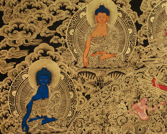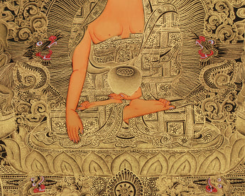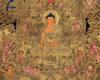 The historical Shakyamuni Buddha is depicted in this exquisite thangka, a true masterpiece of Tibetan sacred art. Created on high-quality cotton canvas, it has genuine 24K gold and acrylic colors that give the divine composition depth and luminosity. The deep black background and the gold accents create a striking contrast, signifying the light of wisdom pursued away from the darkness of ignorance. Shakyamuni Buddha is regarded as the founder of Buddhism and the embodiment of ultimate enlightenment. He attained supreme wisdom and guided countless beings toward liberation.