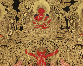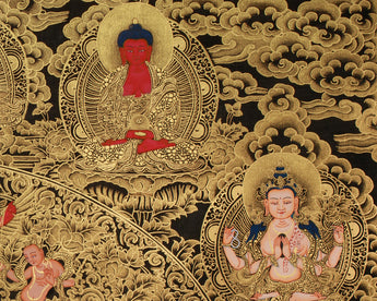 Surrounding the central figure are powerful, enlightened deities, each enriching the thangka’s spiritual depth. Medicine Buddha radiates healing and protection, while Amitayus and Amitabha Buddha bestow longevity and spiritual well-being. Chenrezig and Manjushri illuminate the path of compassion and wisdom, while Green Tara and Namtoshe (Vaishravana) symbolize protection and prosperity. Vajrapani embodies Buddha’s power, and Vajrasattva, with his consort, represents purification and the union of wisdom and method.