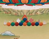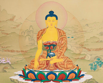 Created with devotion and precision, this historical Shakyamuni Buddha painting is an original hand-painted thangka on pure cotton canvas. The artist used natural Lhasa stone pigments with organic binders to create luminous, lasting hues, accented with genuine 24K gold that radiates spiritual brilliance. These natural materials preserve Tibetan thangka art and reflect the Buddha’s teachings—pure, timeless, and harmonious with earth and spirit. The traditional Karma Gadri style, known for calm landscapes and clarity, enhances the composition, giving each stroke life and depth.