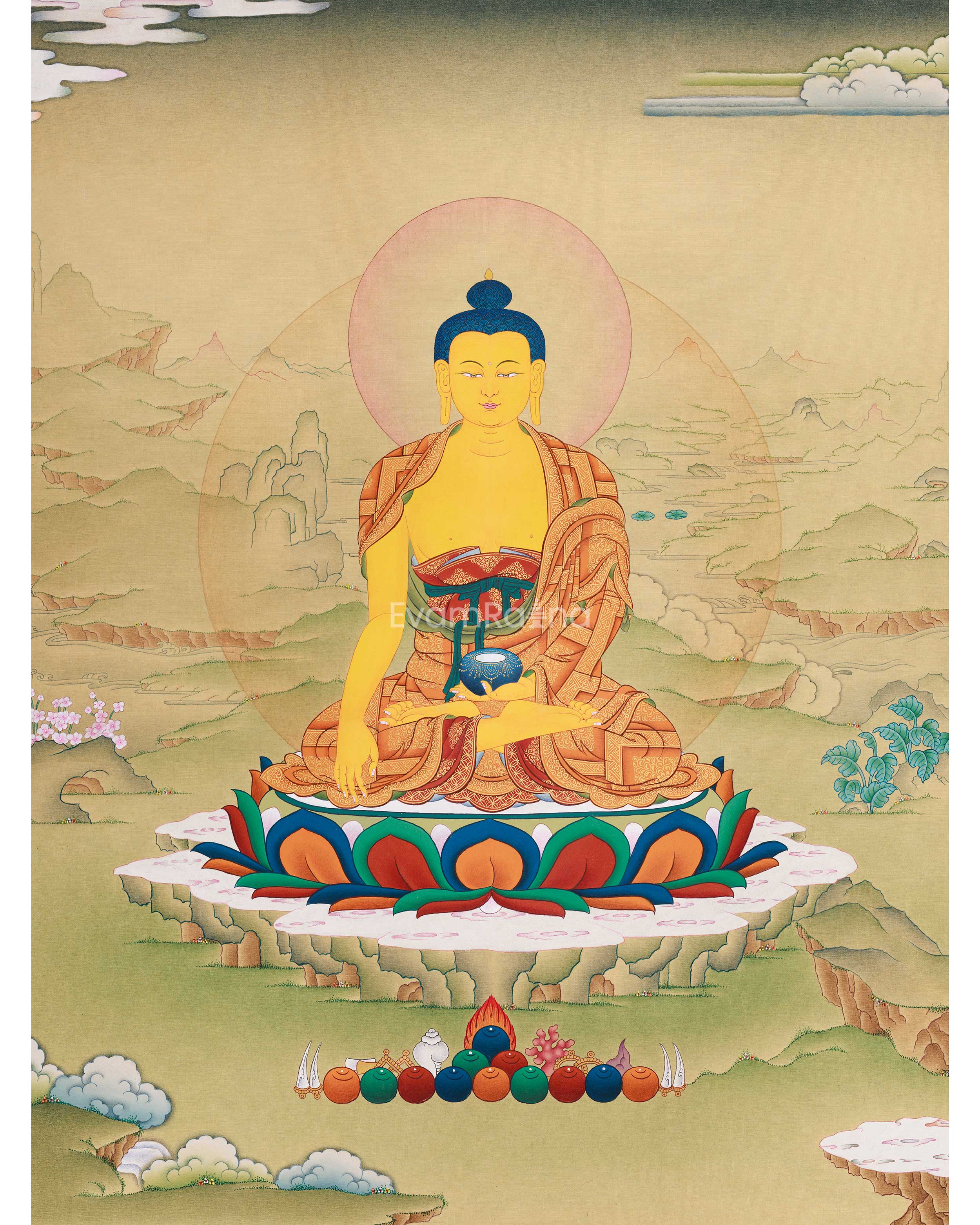 This beautiful thangka showcases the inspiring moment when Shakyamuni Buddha achieved enlightenment beneath the Bodhi tree. His right hand descends into the bhumisparsha mudra, inviting the Earth to bear witness to his awakening. At the same time, his left rests peacefully in meditation, gently holding a begging bowl. The Buddha’s serene face radiates wisdom and tranquility, symbolizing his triumph over ignorance and craving. Sitting gracefully on a lotus throne amidst gentle mountains and flowing clouds, he emanates compassion that touches all corners of the universe. His calm and clarity have been a guiding light for practitioners for over two thousand years.
