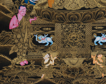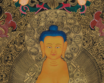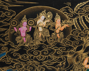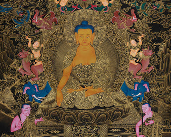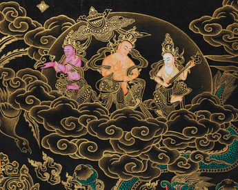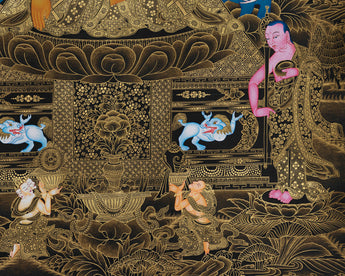 The background features a detailed depiction of clouds and mountainous landscapes, all enriched with 24K gold detailing on black canvas, making this thangka an extraordinary fusion of spiritual elegance and artistic craftsmanship. This exclusive thangka represents the teachings and serenity of Shakyamuni Buddha and his sacred disciples, embodying the enlightenment that guides one towards wisdom, peace, and spiritual fulfillment.