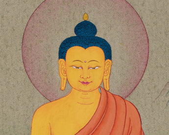 Mini Shakyamuni Buddha Art is a hand-painted thangka depicting the Buddha in his serene, enlightened form. Created in the traditional Karma Gadri style by skilled artisans at the Enlightenment Studio, this artwork embodies spiritual depth and artistic brilliance. Natural stone colors add richness and vibrancy, while the gold highlights create a divine aura, emphasizing the Buddha’s supreme wisdom and compassion.