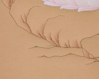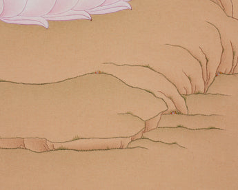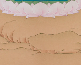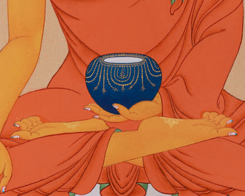 Namo Gautama Buddha, we humbly bow before your enlightened presence, seeking blessings of wisdom, compassion, and peace. The Buddha Thangka is a unique work of art from our Enlightenment Studio. It is meticulously hand-painted using acrylic colors on fine cotton canvas and adorned with genuine 24K gold. The central figure radiates clarity and meditative stillness due to the thangka's exquisite line work, spacious composition, and gentle natural tones, all of which are executed in the traditional Karma Gadri style.