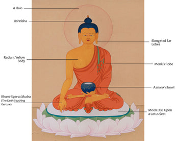 The thangka depicts Buddha in a vajra posture, symbolizing spiritual purity and enlightenment. His right hand touches the earth in the Bhumisparsha Mudra, a gesture that commemorates the moment he called the earth goddess to witness his awakening beneath the Bodhi tree. His left hand holds a monk's bowl, signifying detachment from material concerns and inner wisdom. The golden hue of his body and deep red monastic robe reflect serenity and spiritual authority. Subtle features like the ushnisha, elongated earlobes, and halo enhance his enlightened qualities.