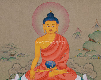 The Peaceful Deity Shakyamuni Buddha Thangka is a profound piece of sacred art that captures the essence of Siddhartha Gautama, the historical Buddha. The thangka is painted on cotton canvas, which serves as a foundation for the artwork's intricate features. Natural stone colors are used to create rich, earthy tones that give the art a deep, organic look, while also enhancing its spiritual vibe. Genuine 24K gold is carefully embedded throughout the painting, highlighting essential features of the Buddha and giving off a divine glow that enhances its sacred presence.