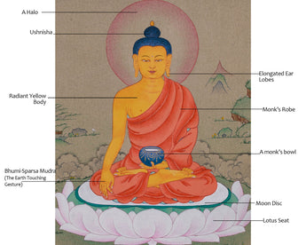 Shakyamuni Buddha, also known as Siddhartha Gautama, is widely recognized as the founder of Buddhism and the ultimate expression of serenity, knowledge, and enlightenment. He is shown in this thangka seated in meditation position, which represents deep thought and inner calm. His right hand is shown in the bhumisparsha mudra, touching the ground and declaring it a witness to his great enlightenment. His left hand is in the dhyana mudra, which represents focus and deep meditation. His movements and calm expression reflect the compassion and wisdom he shared with all beings, guiding them toward spiritual liberation.