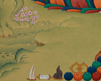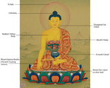 Created in the Karma Gadri style, this thangka follows the artistic traditions established by the Karma Kagyu school. Its gentle color palette and open layout encourage contemplation, allowing the viewer to form a deep connection with the central figure of Shakyamuni Buddha. Depicted in the Bhumisparsa mudra, the earth-touching gesture, the Buddha symbolizes his victory over the forces of Mara and his awakening and enlightenment under the Bodhi tree. His radiant yellow body and elongated earlobes represent his enlightenment and wisdom, while his robe signifies his renunciation of worldly pleasures and his commitment to spiritual liberation.