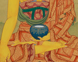 Our Shakyamuni Buddha Wall Art for Meditation is a breathtaking painting that embodies the essence of Buddha's enlightenment and spiritual teachings. Hand-painted with natural stone colors and 24K gold on cotton canvas, this thangka combines timeless materials and expert workmanship to create a stunning visual representation of the historical Buddha. The natural stone colors, highly valued in Tibetan thangka painting, add depth and richness to the piece. The delicate application of 24K gold to the Buddha's robe embellishments and other divine elements symbolizes his enlightenment, wisdom, and transcendence of worldly attachments.