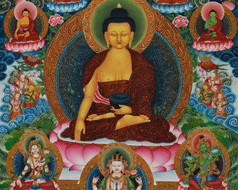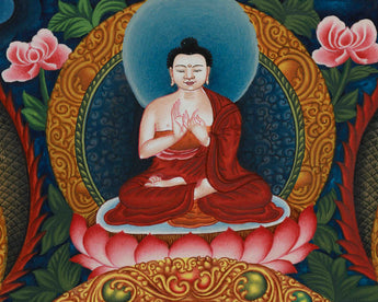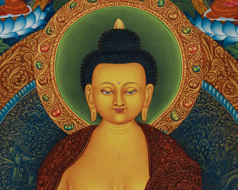 The Tibetan Buddha Shakyamuni thangka exemplifies exceptional artistry, created with acrylics and authentic 24K gold, revealing the essence of traditional Buddhist art. Gold detailing that exudes a divine aura enhances each intricate design, ranging from celestial symbols to spiritual figures. The vibrant colors are seamlessly paired with premium cotton canvas, while the gold highlights create a luminous depth, showcasing the cosmic aspect of every deity. The meticulous brushwork portrays subtle expressions, flowing garments, and intricate decorations, making this piece a unique and stunning addition to any sacred environment.