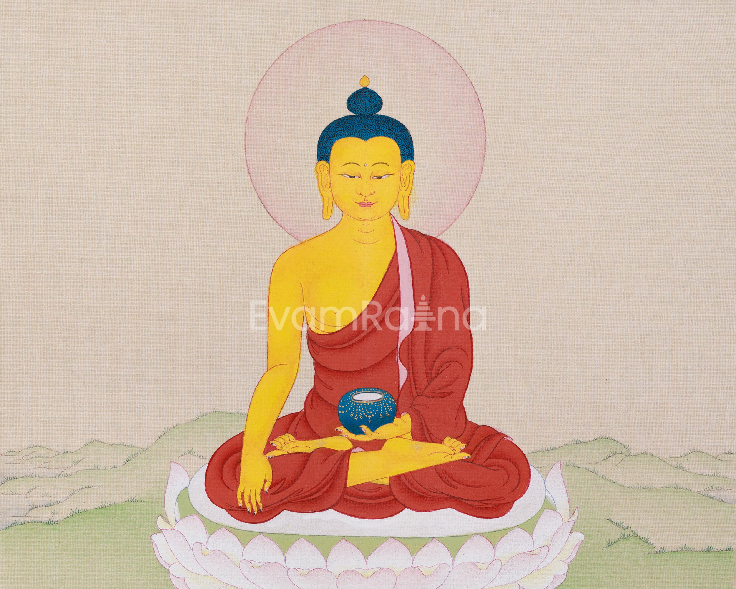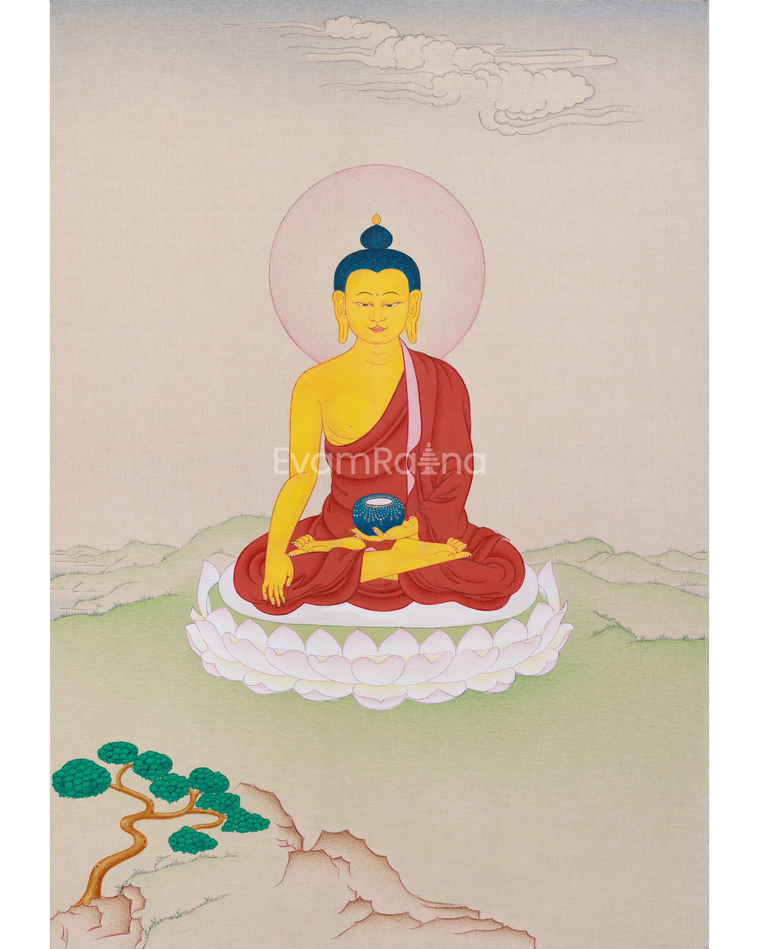 Shakyamuni Buddha, also known as the historical Buddha, was born as Prince Siddhartha in Lumbini around the 6th century BCE. After seeing the realities of suffering, impermanence, and life's fragility, he abandoned his royal life to pursue spiritual awakening. Through intense meditation under the Bodhi Tree, he achieved enlightenment and became Shakyamuni—the Sage of the Shakya Clan—leading many toward liberation. In this thangka, he is depicted in his earth-touching mudra, recalling the moment he called the earth to witness his enlightenment. His golden-yellow body exudes calm wisdom, while his maroon robes cascade softly. Sitting on a pristine white lotus, he holds an alms bowl, symbolizing renunciation and harmony. The tranquil landscape behind—gentle hills, floating clouds, and a solitary tree—evokes a peaceful, sacred mood that enhances his aura of enlightenment.