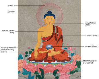 The thangka features a captivating depiction of Shakyamuni Buddha, the historical founder of Buddhism. He achieved enlightenment under the Bodhi tree, becoming a symbol of compassion, wisdom, and freedom from suffering. In the thangka, Shakyamuni performs the Bhumi-Sparsha Mudra, or Ground Touching Gesture, which invites the ground to witness his enlightenment. He sits elegantly on a lotus seat supported by a moon disc, representing transcendence and purity. His serene face, long earlobes, and radiant golden body reflect his spiritual awakening and rejection of materialistic attachments. The monk's robe and alms bowl embody simplicity and the monastic path, while the ushnisha, the crown-like bulge on his head, represents ultimate wisdom. As a profound spiritual symbol, this thangka is ideal for Buddhist altars, meditation spaces, or sacred art collections.