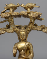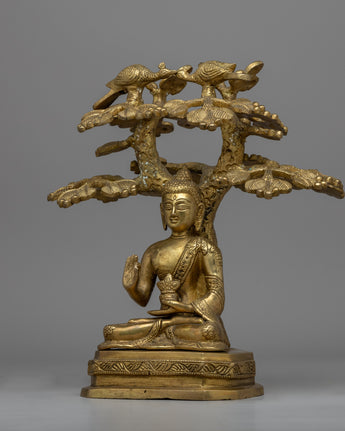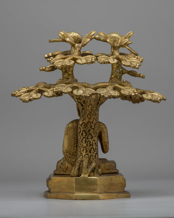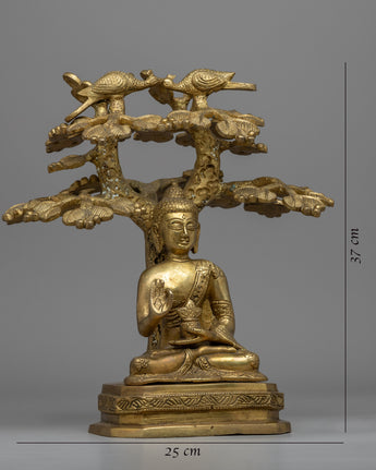 The brass buddha statue is a lovely depiction of the Buddhist deity known for his healing abilities. The Buddha is seated beneath a tree, with intricate details on the branches and leaves. Two birds are artfully crafted at the top of the tree, adding to the statue's overall beauty and symbolism. The rich, golden color of the brass body is polished to a shine, making it a striking addition to any space. This sculpture serves as a powerful reminder of the value of compassion, healing, and inner peace.