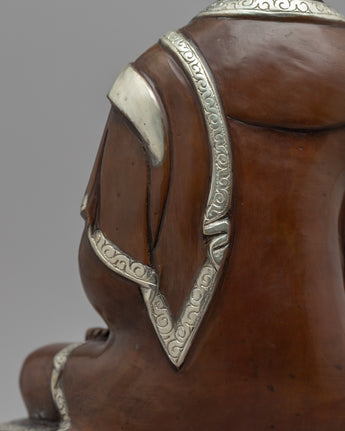 This magnificent and detailed Buda Shakyamuni statue was created by expert artisans on a copper body and plated with shiny silver. Buddha Shakyamuni is depicted in the lotus pose on a lotus base, his hands in the meditation mudra. The artist's expertise and passion are evident in his tranquil look and the meticulously created details on his monastic robe and head ornament. The statue oozes calm and tranquillity, making it an ideal addition to any room for meditation and contemplation.