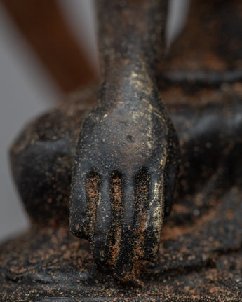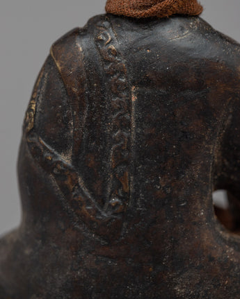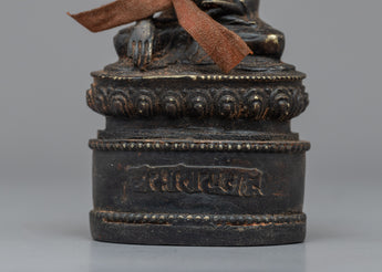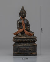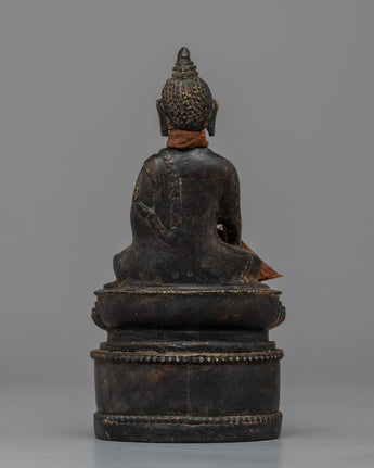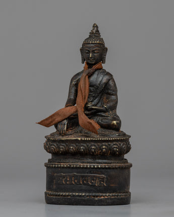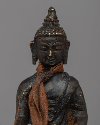 The brass body of this expertly made Buddha Shakyamuni sculpture has an antique polish that gives it a distinctive, worn-in appearance. The historical Buddha, Buddha Shakyamuni, is shown sitting in the sculpture. It displays skillful craftsmanship and minute details that perfectly capture the Buddha's calm face and attitude. A scarf that has been wrapped over the sculpture's neck completes the elegant look. It can inspire and promote spiritual meditation in any setting and serves as a lovely and profound illustration of Buddha's teachings.