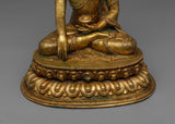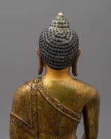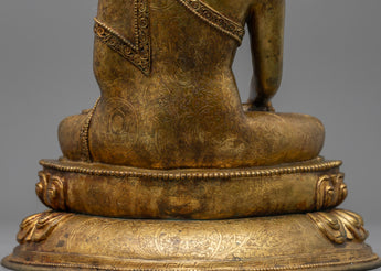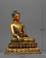 This Buddha Shakyamuni Sculpture Tibet Statue is made of copper that has been 24K gold plated. The handcrafted Buddha Siddhartha Gautama Shakyamuni statue is a beautiful piece of art representing the important moment in Buddhist history when Buddha overcame the world's temptations and achieved enlightenment. Shakyamuni's right hand reaching for the earth, also known as the Bhumisparsha Mudra, symbolizes his victory over Mara and his determination to remain grounded in his path to enlightenment.