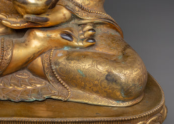 This Shakyamuni Buddha statue, known as the "Sage of the Shakya Clan," portrays the historical Buddha in a moment of serene enlightenment beneath the Bodhi tree. He represents purity and spiritual awakening in the Vajra posture (Padmasana) on a lotus base. His right hand is extended toward the earth in the Bhumisparsha Mudra, inviting the world to witness his enlightenment. His left hand holds an alms bowl in his lap, symbolizing renunciation. The ushnisha atop his head signifies wisdom, and the spiral curls covering his head are said to represent the snails that protected him from the scorching sun during his meditation—an emblem of selfless devotion and nature’s reverence. His serene face reflects inner peace and deep meditation.