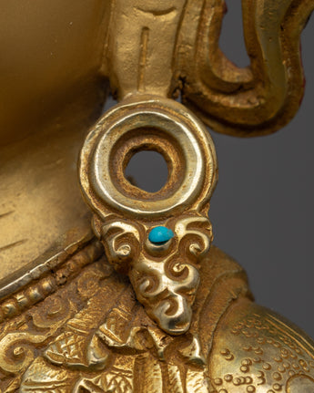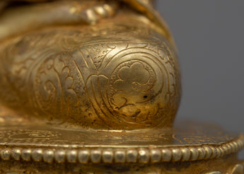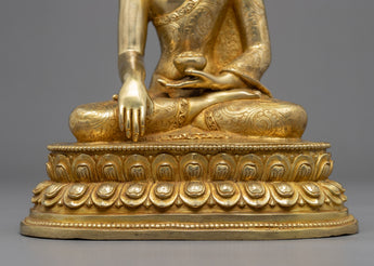 We have exclusively hand-carved this exquisite crown Shakyamuni Buddha statue in a traditional Himalayan style. Our artist has finely crafted the statue on a copper body and gilded it in genuine 24k gold. Deity is depicted sitting on top of a moon disc lotus seat with a serene and peaceful expression. This remarkably high-valued indoor statue will be a tremendous meditating gift for a practitioner like you.
