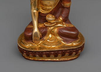 With the help of our Crown Shakyamuni Buddha Statue, find calm and inner peace. With a height of 6.1 inches and a base measuring 3.9 inches, this finely sculpted statue captures the serene demeanor of Master Shakyamuni. Buddha's teachings are embodied in every aspect of this handmade copper object, which is gilded in 24K gold and painted in gold acrylic. Bring harmony to your mind, body, and spirit by incorporating mindfulness and compassion into your daily existence, as demonstrated by the tranquil countenance of Shakyamuni Buddha.