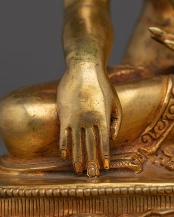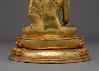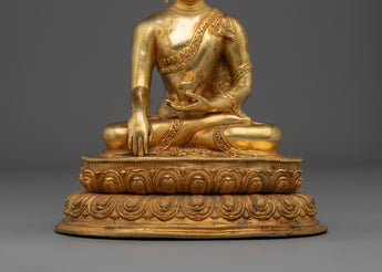 This golden statue of Shakyamuni Buddha is a stunning depiction of the Buddha, representing peace, wisdom, and spiritual enlightenment. This beautiful statue, measuring 27.5cm tall by 24cm wide and weighing 2.94kg, is precisely carved from copper and gold-plated for a brilliant finish that enhances its divine presence. Shakyamuni Buddha is represented in the classic earth-touching mudra (bhumisparsha), symbolizing his moment of enlightenment and inviting the Earth to witness his profound realization. The peaceful expression, intricately detailed robes, and lotus base embody traditional Tibetan artistry and the essence of meditation.